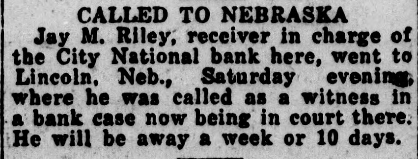 CALLED TO NEBRASKA Jay M. Riley, receiver in charge of the City National bank here, went to Lincoln, Neb., Saturday evenimg where he was called as a witness in a bank case now being in court there. He will be away a week or 10 days.