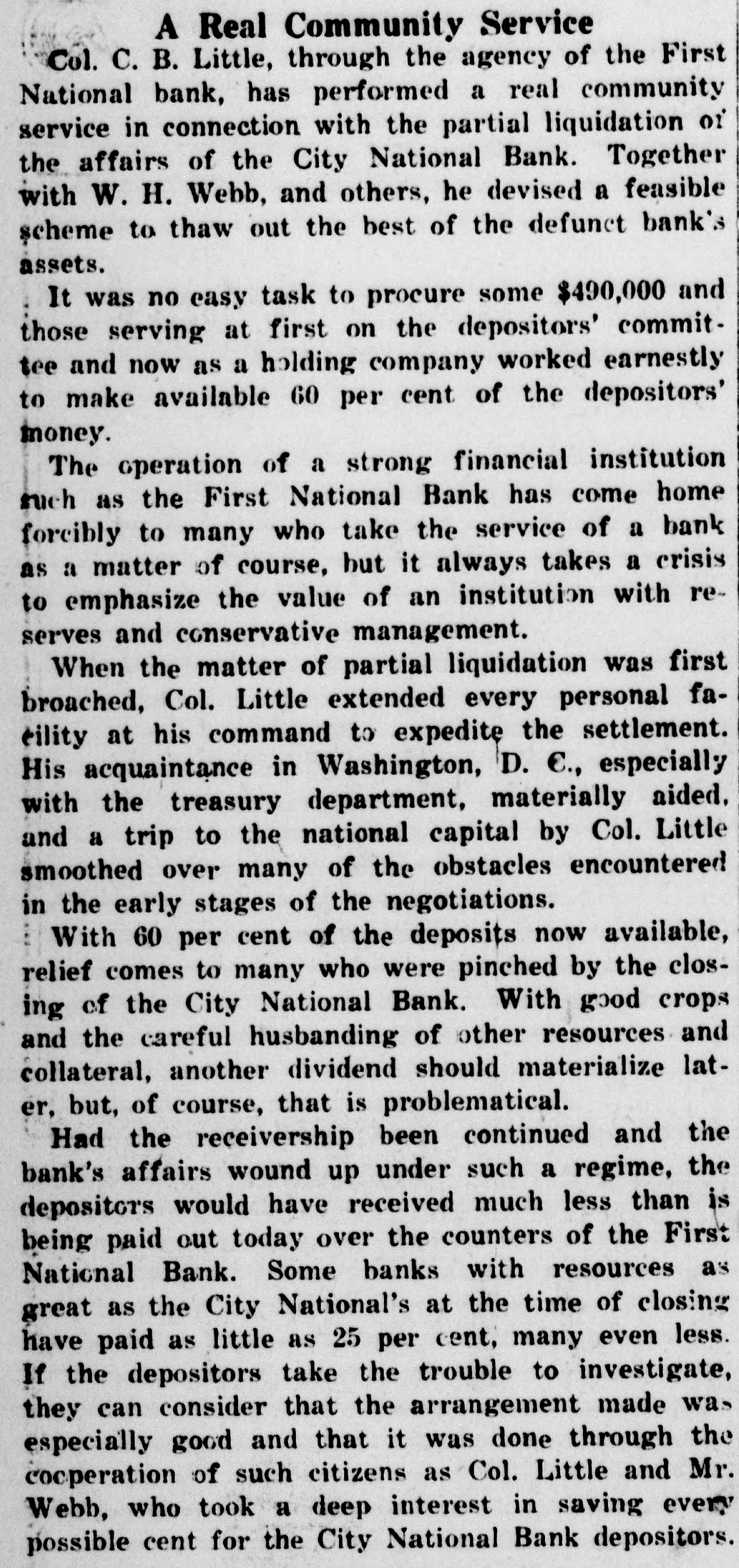 Had the receivership been continued and the bank's affairs wound up under such a regime, the depositors would have received much less than is being paid out today over the counters of the First National Bank. Some banks with resources as great as the City National's at the time of closing have paid as little as 25 per cent, many even less. If the depositors take the trouble to investigate, they can consider that the arrangement made was especially good and that it was done through the cooperation of such citizens as Col. Little and Mr. Webb, who took a deep interest in saving every possible cent for the City National Bank depositors.