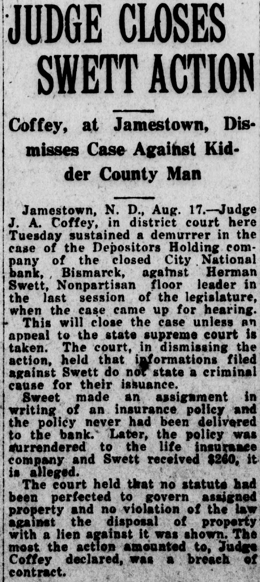 JUDGE CLOSES SWETT ACTION Coffey, at Jamestown, Dismisses Case Against Kidder County Man Jamestown, N. D., Aug. 17.-Judge J. A. Coffey, in district court here Tuesday sustained a demurrer in the case of the Depositors Holding company of the closed City National bank, Bismarck, against Herman Swett, Nonpartisan floor leader in the last session of the legislature, when the case came up for hearing. This will close the case unless an appeal to the state supreme court is taken. The court, in dismissing the action, held that informations filed against Swett do not state a criminal cause for their issuance. Sweet made an assignment in writing of an insurance policy and the policy never had been delivered to the bank. Later, the policy was surrendered to the life insurance company and Swett received $260, it is alleged. The court held that no statute had been perfected to govern assigned property and no violation of the law against the disposal of property with a lien against it was shown. The most the action amounted to, Judge Coffey declared, was a breach of contract.