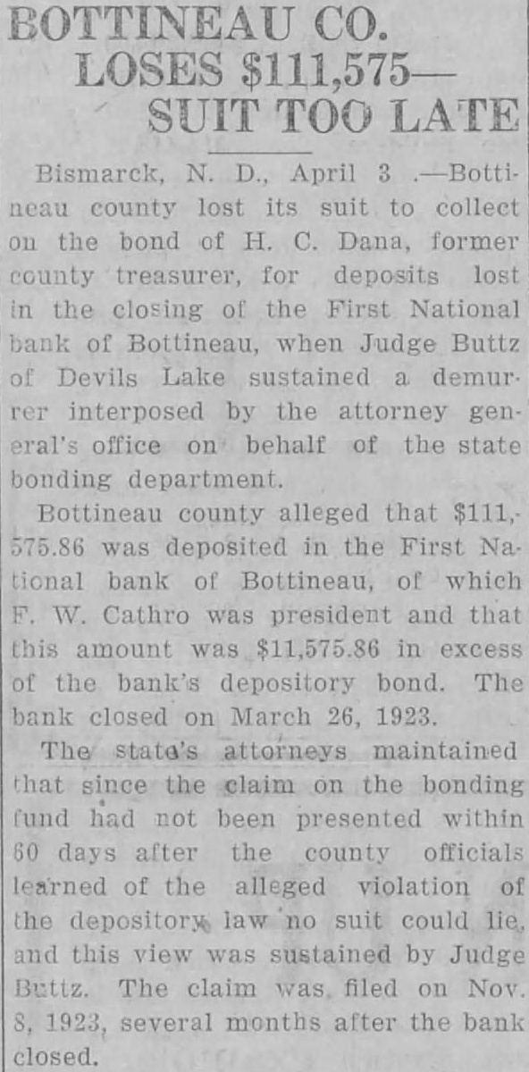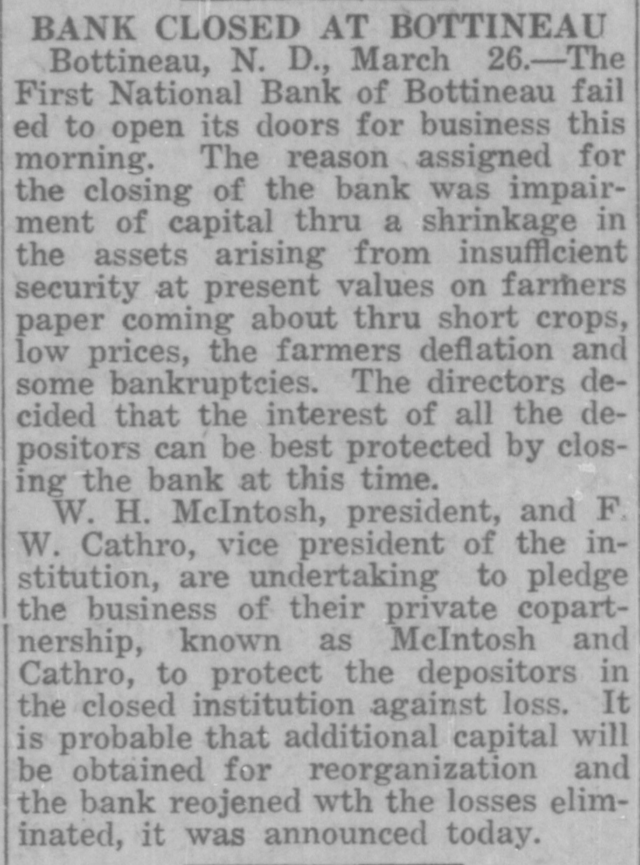 BANK CLOSED AT BOTTINEAU Bottineau, N. D., March 26.-The First National Bank of Bottineau fail ed to open its doors for business this morning. The reason assigned for the closing of the bank was impairment of capital thru a shrinkage in the assets arising from insufflcient security at present values on farmers paper coming about thru short crops, low prices, the farmers deflation and some bankruptcies. The directors decided that the interest of all the depositors can be best protected by closing the bank at this time. W. H. McIntosh, president, and F. W. Cathro, vice president of the institution, are undertaking to pledge the business of their private copartnership, known as McIntosh and Cathro, to protect the depositors in the closed institution against loss. It is probable that additional capital will be obtained for reorganization and the bank reojened wth the losses eliminated, it was announced today.
