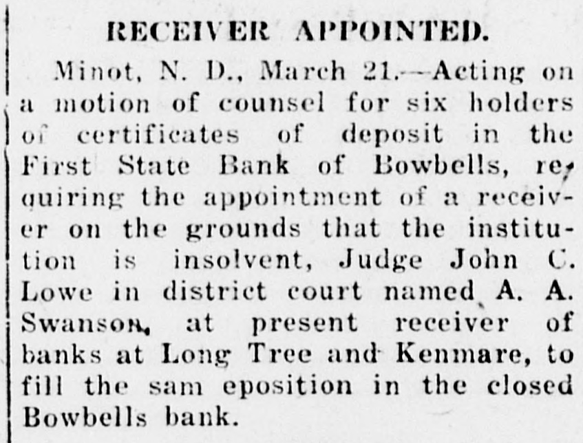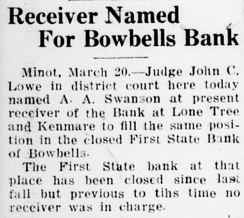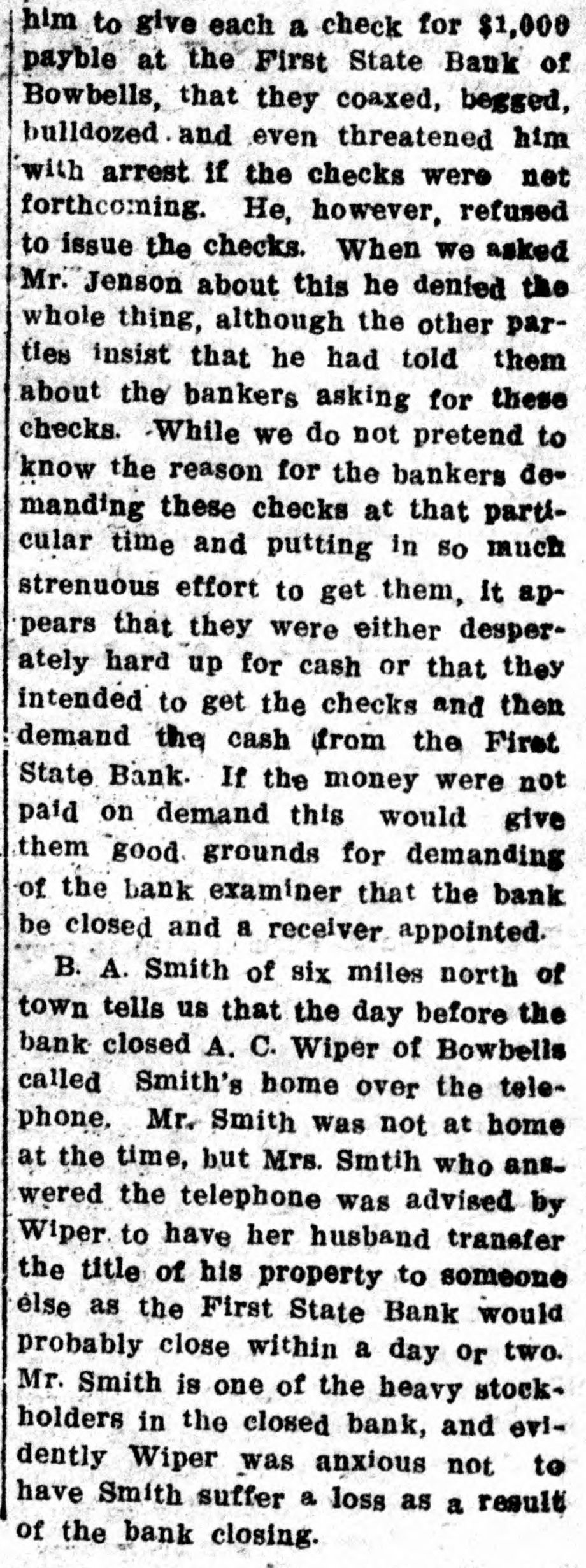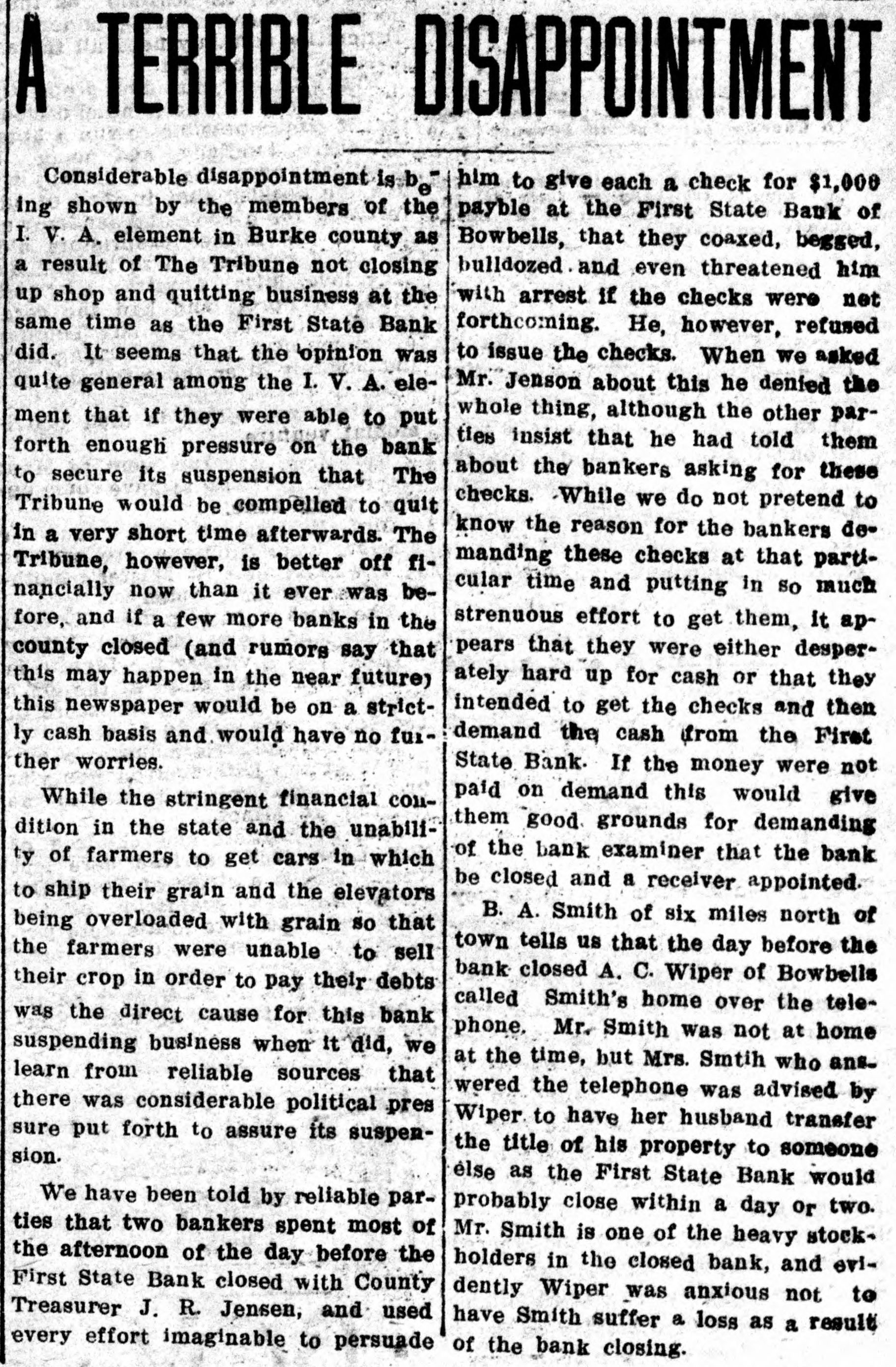 A TERRIBLE DISAPPOINTMENT Considerable disappointment is him to give each a check for $1,000 ing shown by the members of the payble at the First State Bank of I. V. A. element in Burke county as Bowbells, that they coaxed, begged, a result of The Tribune not closing bulldozed and even threatened him up shop and quitting business at the with arrest if the checks were net same time as the First State Bank forthcoming. He, however, refused did. It seems that the opinion was to issue the checks. When we asked quite general among the I. V. A. eleMr. Jenson about this he denied the whole thing, although the other parment that if they were able to put ties insist that he had told them forth enough pressure on the bank about the bankers asking for these to secure its suspension that The checks. While we do not pretend to Tribune would be compelled to quit know the reason for the bankers dein a very short time afterwards. The manding these checks at that partiTribune, however, is better off ficular time and putting in so much nancially now than it ever was before, and if a few more banks in the strenuous effort to get them, it appears that they were either despercounty closed (and rumors say that ately hard up for cash or that they this may happen in the near future) this newspaper would be on a strictintended to get the checks and then demand the cash from the First ly cash basis and would have no fur ther worries. State Bank. If the money were not paid on demand this would give While the stringent financial conthem good grounds for demanding dition in the state and the unabiliof the bank examiner that the bank ty of farmers to get cars in which be closed and a receiver appointed. to ship their grain and the elevators B. A. Smith of six miles north of being overloaded with grain so that town tells us that the day before the the farmers were unable to sell bank closed A. C. Wiper of Bowbells their crop in order to pay their debts called Smith's home over the telewas the direct cause for this bank phone. Mr. Smith was not at home suspending business when it did, we at the time, but Mrs. Smtih who ans. learn from reliable sources that wered the telephone was advised by there was considerable political pres Wiper to have her husband transfer sure put forth to assure its suspenthe title of his property to someone sion. élse as the First State Bank would We have been told by reliable parprobably close within a day or two. ties that two bankers spent most of Mr. Smith is one of the heavy stockthe afternoon of the day before the holders in the closed bank, and eviFirst State Bank closed with County dently Wiper was anxious not to Treasurer J. R. Jensen, and used have Smith suffer a loss as a result every effort imaginable to persuade of the bank closing.