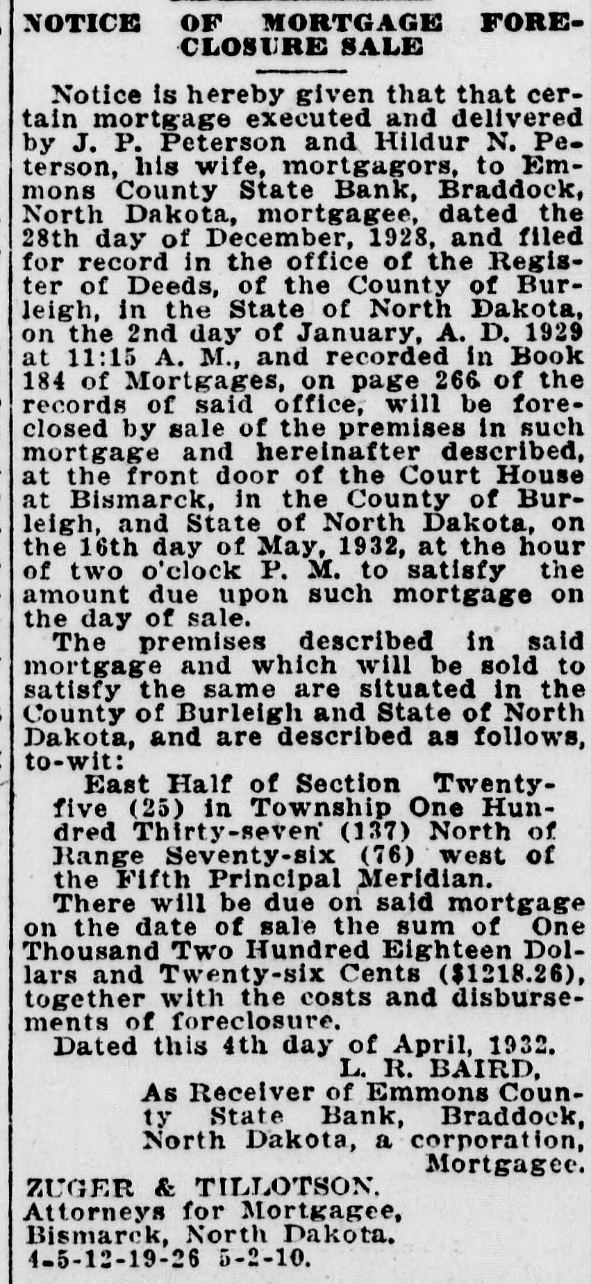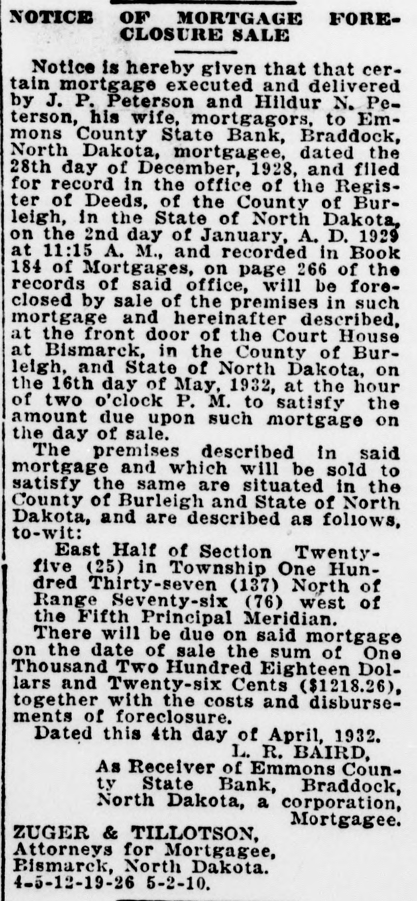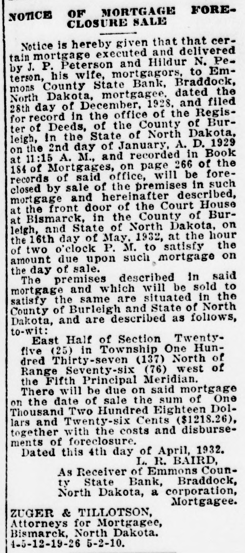 NOTICE OF MORTGAGE FORECLOSURE SALE Notice is hereby given that that certain mortgage executed and delivered by J. P. Peterson and Hildur N. Peterson, his wife, mortgagors, to Emmons County State Bank, Braddock, North Dakota, mortgagee, dated the 28th day of December, 1928, and filed for record in the office of the Register of Deeds, of the County of Burleigh, in the State of North Dakota, on the 2nd day of January, A. D. 1929 at 11:15 A. M., and recorded in Book 184 of Mortgages, on page 266 of the records of said office, will be foreclosed by sale of the premises in such mortgage and hereinafter described, at the front door of the Court House at Bismarck, in the County of Burleigh, and State of North Dakota, on the 16th day of May, 1932, at the hour of two o'clock P. M. to satisfy the amount due upon such mortgage on the day of sale. The premises described in said mortgage and which will be sold to satisfy the same are situated in the County of Burleigh and State of North Dakota, and are described as follows, to-wit: East Half of Section Twentyfive (25) in Township One Hundred Thirty-seven (137) North of Range Seventy-six (76) west of the Fifth Principal Meridian. There will be due on said mortgage on the date of sale the sum of One Thousand Two Hundred Eighteen Dollars and Twenty-six Cents ($1218.26), together with the costs and disbursements of foreclosure. Dated this 4th day of April, 1932. L. R. BAIRD, As Receiver of Emmons County State Bank, Braddock, North Dakota, a corporation, Mortgagee. ZUGER & TILLOTSON, Attorneys for Mortgagee, Bismarck, North Dakota. 4-5-12-19-26 5-2-10.