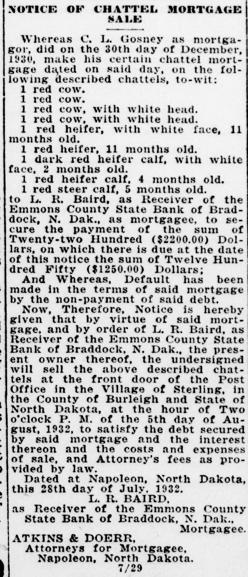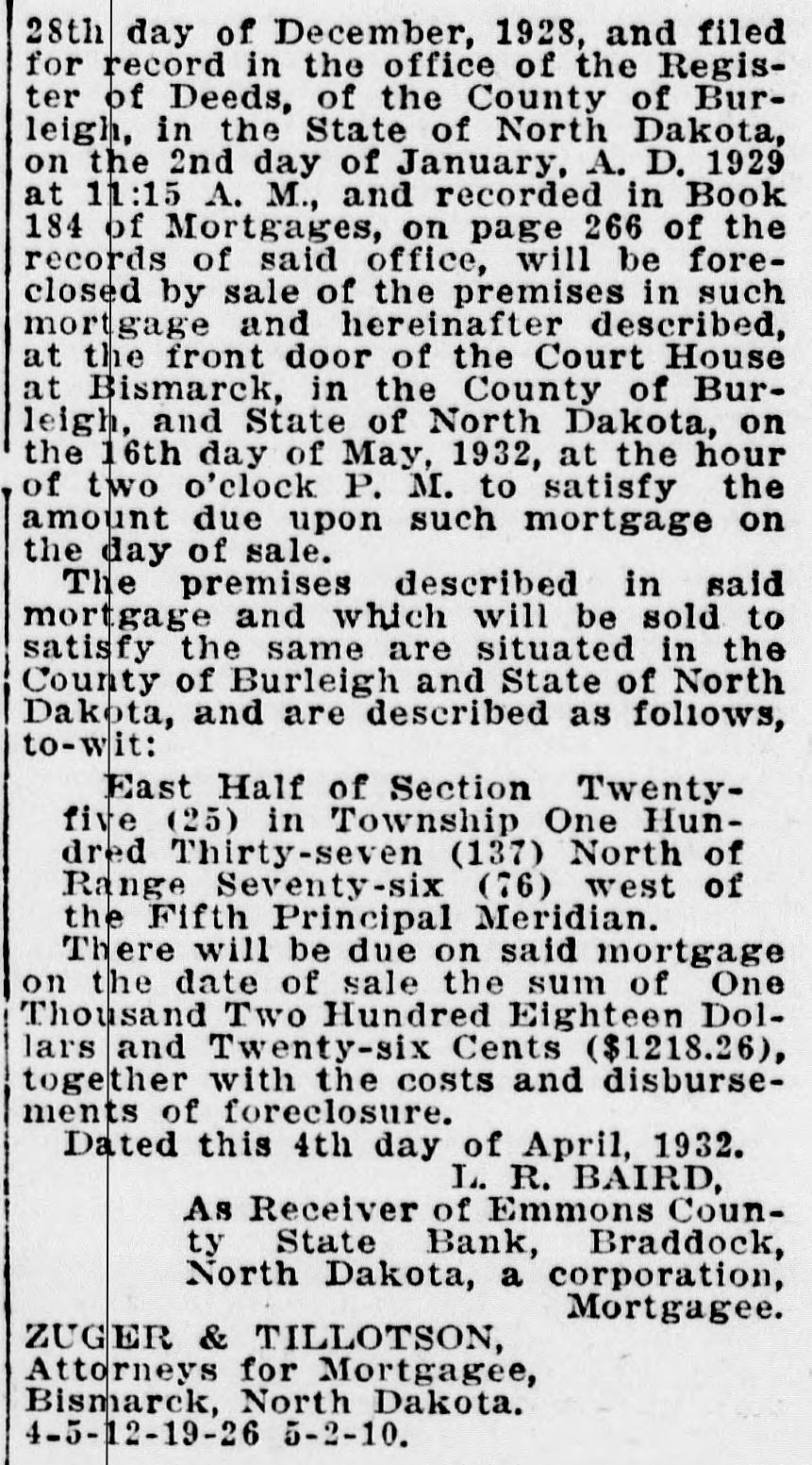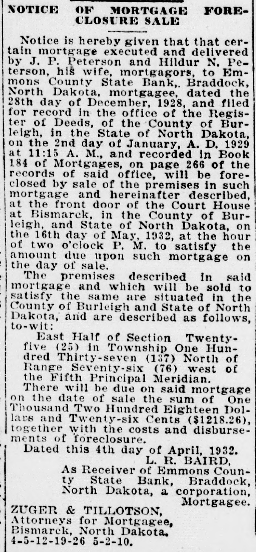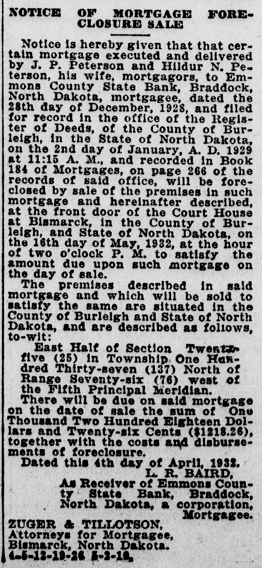 NOTICE OF MORTGAGE FORECLOSURE SALE Notice is hereby given that that certain mortgage executed and delivered by J. P. Peterson and Hildur N. Peterson, his wife, mortgagors, to Emmons County State Bank, Braddock, North Dakota, mortgagee, dated the 28th day of December, 1928, and filed for record in the office of the Register of Deeds, of the County of Burleigh, in the State of North Dakota, on the 2nd day of January, A. D. 1929 at 11:15 A. M., and recorded in Book 184 of Mortgages, on page 266 of the records of said office, will be foreclosed by sale of the premises in such mortgage and hereinafter described, at the front door of the Court House at Bismarck, in the County of Burleigh, and State of North Dakota, on the 16th day of May, 1932, at the hour of two o'clock P. M. to satisfy the amount due upon such mortgage on the day of sale. The premises described in said mortgage and which will be sold to satisfy the same are situated in the County of Burleigh and State of North Dakota, and are described as follows, to-wit: East Half of Section Twentyfive (25) in Township One Hundred Thirty-seven (137) North of Range Seventy-six (76) west of the Fifth Principal Meridian. There will be due on said mortgage on the date of sale the sum of One Thousand Two Hundred Eighteen Dollars and Twenty-six Cents ($1218.26), together with the costs and disbursements of foreclosure. Dated this 4th day of April, 1932. L. R. BAIRD, As Receiver of Emmons County State Bank, Braddock, North Dakota, a corporation, Mortgagee. ZUGER & TILLOTSON, Attorneys for Mortgagee, Bismarck, North Dakota. 4-5-12-19-26 5-2-10.