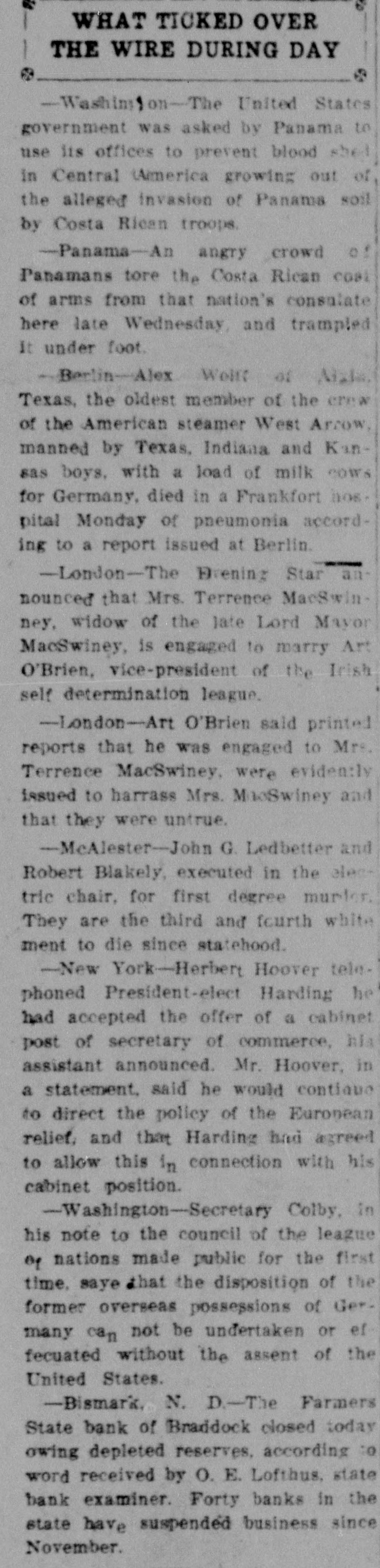 WHAT TICKED OVER THE WIRE DURING DAY 8 9 -Washimon-The United States government was asked by Panama to use its offices to prevent blood shel in Central America growing out of the alleged invasion of Panama soil by Costa Rican troops. -Panama-An angry crowd of Panamans tore the Costa Rican cost of arms from that nation's consulate here late Wednesday, and trampled It under foot. - Berlin-Alex Weift of Aide Texas, the oldest member of the erew of the American steamer West Arrow, manned by Texas, Indiana and Kansas boys. with a load of milk COW S for Germany, died in a Frankfort nos. pital Monday of pneumonia according to a report issued at Berlin. -London-The Brenin : Star an nounced that Mrs. Terrence MacSwinney, widow of the late Lord Mayor MacSwiney, is engaged to marry Art O'Brien, vice-president of the Irish self determination league. -London-Art O'Brien said printed reports that he was engaged to Mrs. Terrence MacSwiney, were evidently issued to harrass Mrs. MacSwiney and that they were untrue. -MeAlester-John G. Ledbetter and Robert Blakely, executed in the electric chair, for first degree murlor. They are the third and fourth white ment to die since statehood. -New York-Herbert Hoover telephoned President-elect Harding he had accepted the offer of a cabinet post of secretary of commerce, his assistant announced. Mr. Hoover, in a statement, said he would contique to direct the policy of the European relief. and that Harding had agreed to allow this in connection with his cabinet position. -Washington-Secretary Colby, in his note to the council of the league of nations made public for the first time. saye that the disposition of the former overseas possessions of Germany can not be undertaken or el fecuated without the assent of the United States. -Bismark. N. D.-The Farmers State bank of Braddock closed today owing depleted reserves, according to word received by O. E. Lofthus, state bank examiner. Forty banks in the state have suspended business since November.