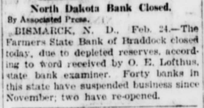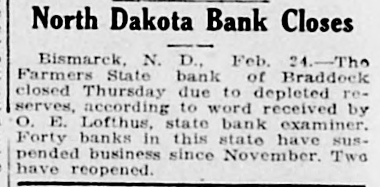 North Dakota Bank Closed. By Associated Press. BISMARCK N. D. Feb. 24.-The Farmers State Bank of Braddock closed today. due to depleted reserves. accord. ing to word received by O. E. Lofthus, state bank examiner. Forty banks in this state have suspended business since November two have re-opened.