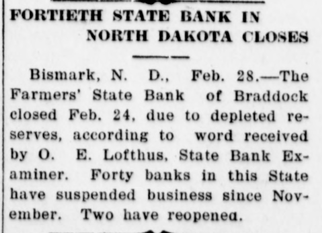 FORTIETH STATE BANK IN NORTH DAKOTA CLOSES Bismark, N. D., Feb. 28.-The Farmers' State Bank of Braddock closed Feb. 24, due to depleted reserves, according to word received by O. E. Lofthus, State Bank Examiner. Forty banks in this State have suspended business since November. Two have reopened.