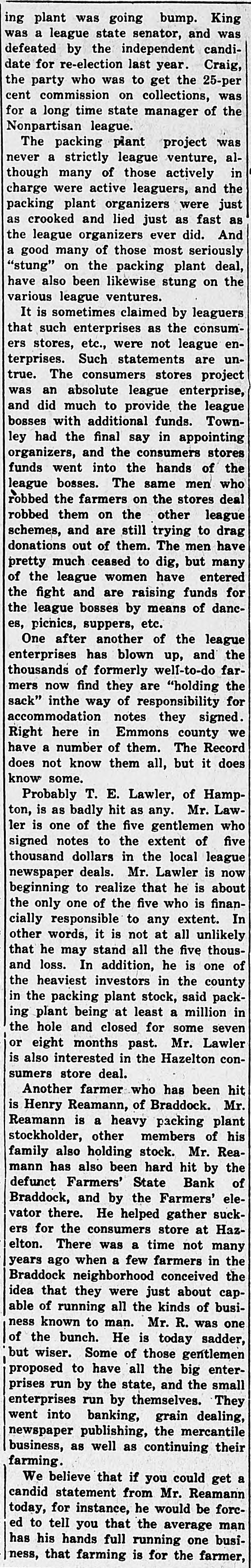 ing plant was going bump. King was a league state senator, and was defeated by the independent candidate for re-election last year. Craig, the party who was to get the 25-per cent commission on collections, was for a long time state manager of the Nonpartisan league. The packing plant project was never a strictly league venture, although many of those actively in charge were active leaguers, and the packing plant organizers were just as crooked and lied just as fast as the league organizers ever did. And a good many of those most seriously "stung" on the packing plant deal, have also been likewise stung on the various league ventures. It is sometimes claimed by leaguers that such enterprises as the consumers stores, etc., were not league enterprises. Such statements are untrue. The consumers stores project was an absolute league enterprise, and did much to provide the league bosses with additional funds. Townley had the final say in appointing organizers, and the consumers stores funds went into the hands of the league bosses. The same men who robbed the farmers on the stores deal robbed them on the other league schemes, and are still trying to drag donations out of them. The men have pretty much ceased to dig, but many of the league women have entered the fight and are raising funds for the league bosses by means of dances, picnics, suppers, etc. One after another of the league enterprises has blown up, and the thousands of formerly welf-to-do farmers now find they are "holding the sack" inthe way of responsibility for accommodation notes they signed. Right here in Emmons county we have a number of them. The Record does not know them all, but it does know some. Probably T. E. Lawler, of Hampton, is as badly hit as any. Mr. Lawler is one of the five gentlemen who signed notes to the extent of five thousand dollars in the local league newspaper deals. Mr. Lawler is now beginning to realize that he is about the only one of the five who is financially responsible to any extent. In other words, it is not at all unlikely that he may stand all the five thousand loss. In addition, he is one of the heaviest investors in the county in the packing plant stock, said packing plant being at least a million in the hole and closed for some seven or eight months past. Mr. Lawler is also interested in the Hazelton consumers store deal. Another farmer who has been hit is Henry Reamann, of Braddock. Mr. Reamann is a heavy packing plant stockholder, other members of his family also holding stock. Mr. Reamann has also been hard hit by the defunct Farmers' State Bank of Braddock, and by the Farmers' elevator there. He helped gather suckers for the consumers store at Hazelton. There was a time not many years ago when a few farmers in the Braddock neighborhood conceived the idea that they were just about capable of running all the kinds of business known to man. Mr. R. was one of the bunch. He is today sadder, but wiser. Some of those gentlemen proposed to have all the big enterprises run by the state, and the small enterprises run by themselves. They went into banking, grain dealing, newspaper publishing, the mercantile business, as well as continuing their farming. We believe that if you could get a candid statement from Mr. Reamann today, for instance, he would be forced to tell you that the average man has his hands full running one business, that farming is for the farmer,