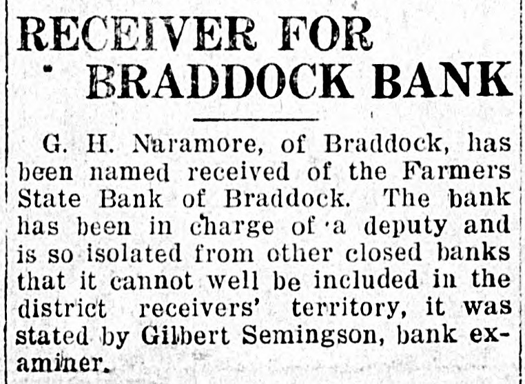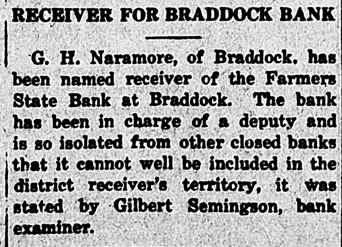 RECEIVER FOR BRADDOCK BANK G. H. Naramore, of Braddock. has been named receiver of the Farmers State Bank at Braddock. The bank has been in charge of a deputy and is so isolated from other closed banks that it cannot well be included in the district receiver's territory, it was stated by Gilbert Semingson, bank examiner.