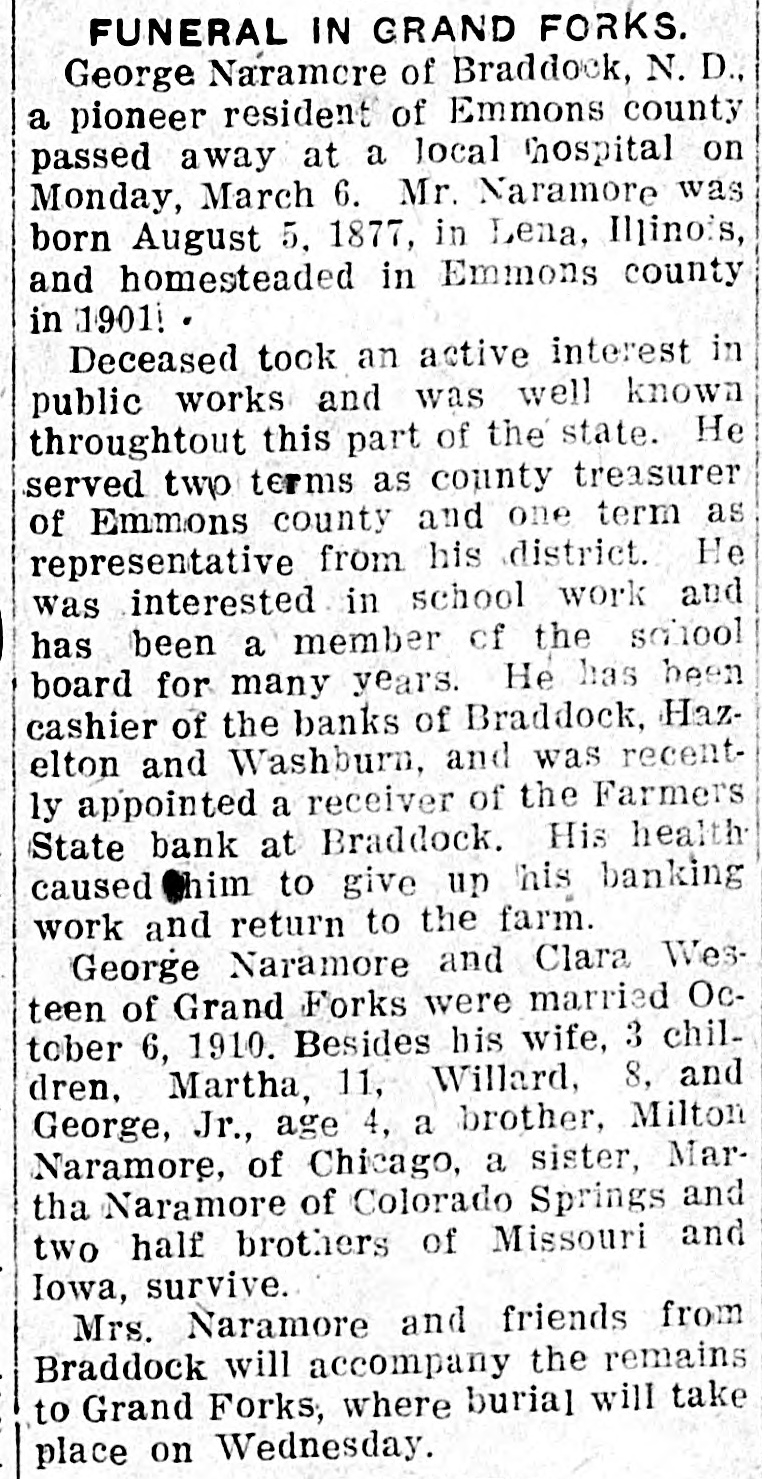 FUNERAL IN GRAND FORKS. George Naramcre of Braddock, N. D., a pioneer resident of Emmons county passed away at a local hospital on Monday, March 6. Mr. Naramore was born August 5. 1877, in Lena, Illinois, and homesteaded in Emmons county in 1901 Deceased tock an active interest in public works and was well known throughtout this part of the state. He served two terms as county treasurer of Emmons county and one term as representative from his district. He was interested in school work and has been a member cf the school board for many years. He has been cashier of the banks of Braddock, Hazelton and Washburn, and was recently appointed a receiver of the Farmers State bank at Braddock. His health caused Shim to give up his banking work and return to the farm. George Naramore and Clara Westeen of Grand Forks were married October 6, 1910. Besides his wife, 3 children. Martha, 11, Willard, 8, and George, Jr., age 4, a brother, Milton Naramore, of Chicago, a sister, Martha Naramore of Colorado Springs and two half brothers of Missouri and Iowa, survive. Mrs. Naramore and friends from Braddock will accompany the remains to Grand Forks, where burial will take place on Wednesday.