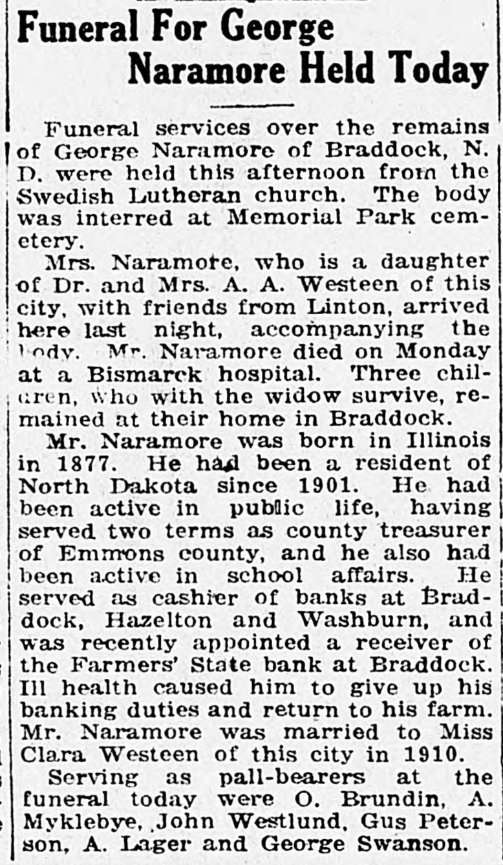 Funeral For George Naramore Held Today Funeral services over the remains of George Naramore of Braddock, N. D. were held this afternoon from the Swedish Lutheran church. The body was interred at Memorial Park cemetery. Mrs. Naramore, who is a daughter of Dr. and Mrs. A. A. Westeen of this city, with friends from Linton, arrived here last night, accompanying the body. Mr. Naramore died on Monday at a Bismarck hospital. Three chileren, who with the widow survive, remained at their home in Braddock. Mr. Naramore was born in Illinois in 1877. He had been a resident of North Dakota since 1901. He had been active in public life, having served two terms as county treasurer of Emmons county, and he also had been active in school affairs. He served as cashier of banks at Braddock, Hazelton and Washburn, and was recently appointed a receiver of the Farmers' State bank at Braddock. Ill health caused him to give up his banking duties and return to his farm. Mr. Naramore was married to Miss Clara Westeen of this city in 1910. Serving as pall-bearers at the funeral today were O. Brundin, A. Myklebye, John Westlund, Gus Peterson, A. Lager and George Swanson.