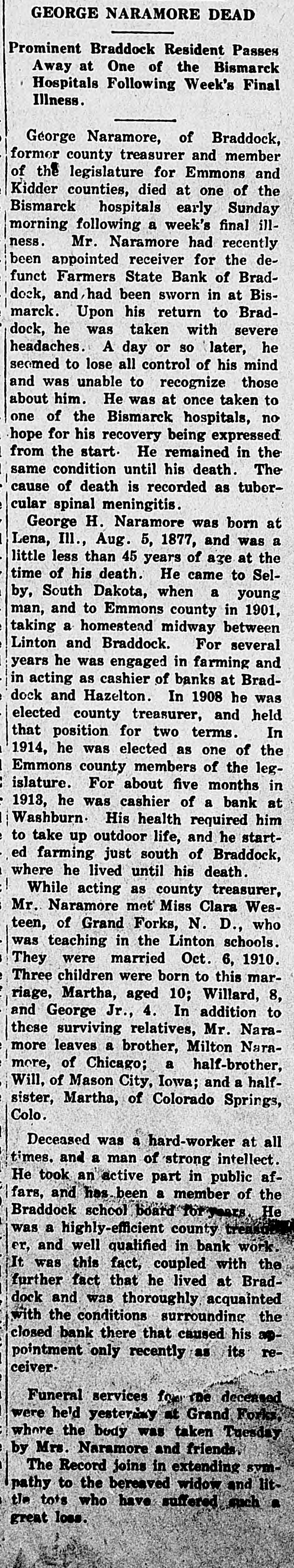 GEORGE NARAMORE DEAD Prominent Braddock Resident Passes Away at One of the Bismarck Hospitals Following Week's Final Illness. George Naramore, of Braddock, former county treasurer and member of the legislature for Emmons and Kidder counties, died at one of the Bismarck hospitals early Sunday morning following a week's final illness. Mr. Naramore had recently been appointed receiver for the defunct Farmers State Bank of Braddock, and had been sworn in at Bismarck. Upon his return to Braddock, he was taken with severe headaches. A day or so later, he seemed to lose all control of his mind and was unable to recognize those about him. He was at once taken to one of the Bismarck hospitals, no hope for his recovery being expressed from the start. He remained in the same condition until his death. The cause of death is recorded as tubercular spinal meningitis. George H. Naramore was born at Lena, Ill., Aug. 5, 1877, and was a little less than 45 years of age at the time of his death. He came to Selby, South Dakota, when a young man, and to Emmons county in 1901, taking a homestead midway between Linton and Braddock. For several years he was engaged in farming and in acting as cashier of banks at Braddock and Hazelton. In 1908 he was elected county treasurer, and held that position for two terms. In 1914, he was elected as one of the Emmons county members of the legislature. For about five months in 1913, he was cashier of a bank at Washburn. His health required him to take up outdoor life, and he started farming just south of Braddock, where he lived until his death. While acting as county treasurer, Mr. Naramore met Miss Clara Westeen, of Grand Forks, N. D., who was teaching in the Linton schools. They were married Oct. 6, 1910. Three children were born to this marriage, Martha, aged 10; Willard, 8, and George Jr., 4. In addition to these surviving relatives, Mr. Naramore leaves a brother, Milton Naramore, of Chicago; a half-brother, Will, of Mason City, Iowa; and a halfsister, Martha, of Colorado Springs, Colo. Deceased was a hard-worker at all times. and a man of strong intellect. He took an active part in public affars, and has been a member of the Braddock school board for years He was a highly-efficient county treasur er, and well qualified in bank work. It was this fact, coupled with the further fact that he lived at Braddock and was thoroughly acquainted with the conditions surrounding the closed bank there that caused his appointment only recently as its receiver. Funeral services for the deceased were he'd yestering at Grand Forks, where the body was taken Tuesday by Mrs. Naramore and friends. The Record joins in extending svmpathy to the bereaved widow and little tots who have suffered such a great loss.