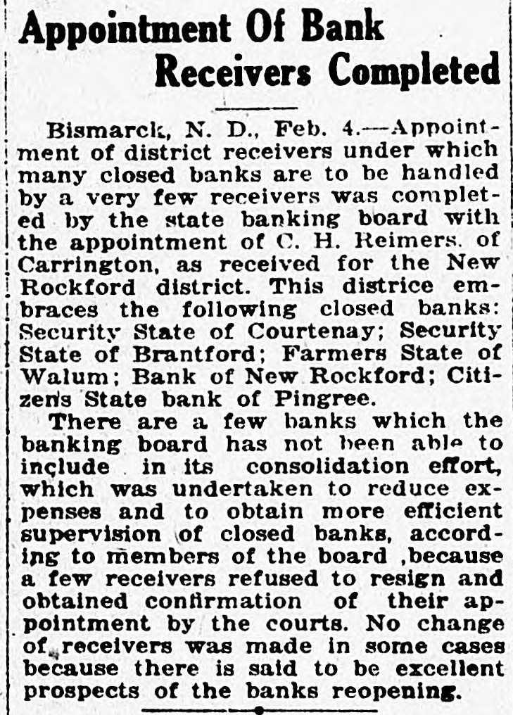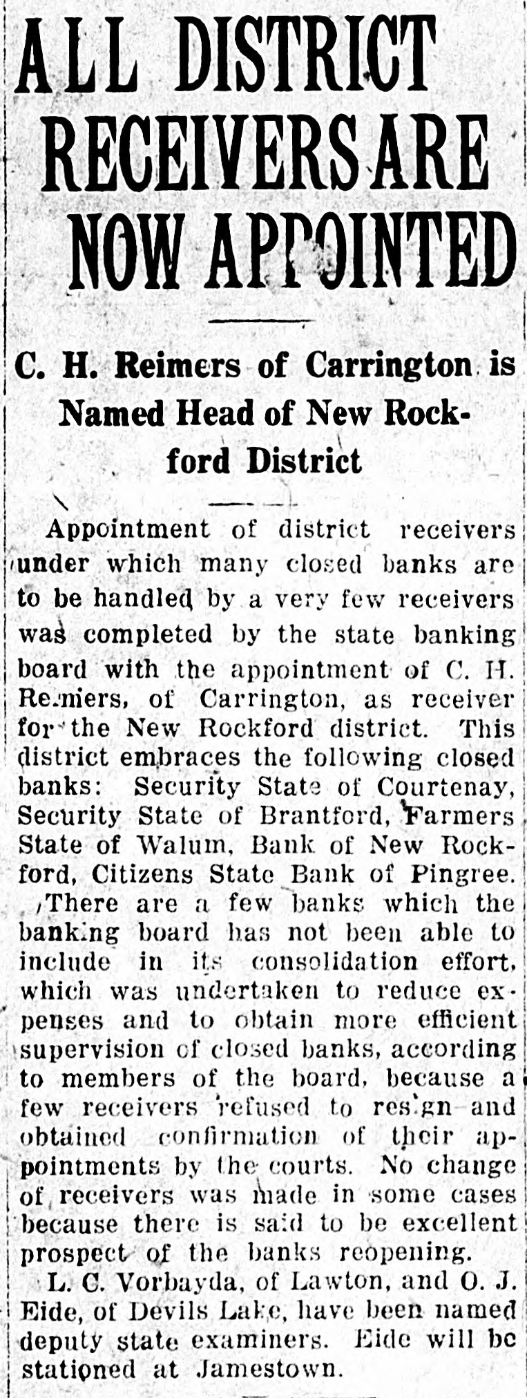 here. Grand Niles Fire destroyed the Cullen Forks vator Grand Forks- Growers' The association July 23. Wool convention at the County held its annual were elected ProVelva- Directors of the Velva Coal annual meeting here. Kirkland of Van has ducts company Hook-Rev accepted R. J. a call to Searcy, Ark., Church of the Nazarene. has resigned as Elevator has the Parshall- business local manager E. Hannon company. of the Farmers just a completed Cooperative Stanley-The big Stanley booster band tour of this the Fort section. Elbowoods-Inrecervation Indians of will hold Berthold a fair here Indian September Gilbert 26 W. to 28. Davis, North Da- 85 a is dead. face years Fargo- old and Col. last resident 25 years, of schools kota for the Bowman inability financial Bowman- stringency The state. due to father a to get funds from Popelka, the 45, followed years Mandan- example John set by his with a shotgun. six damthe killing himself 10,000 hail year. Bismarck-Abo filed this year at age claims have the figure last This about exceeds 1,000. 56, this time by Smith, negro, He Bismarck- Carl Bismarck in 1950. then has a barred date in from the for city vagrancy until have was following his arrest Funeral services Grand Forks- N. Wells, pioneer vicnorthwest been hotel held for H. man. He was a of pneumonia. working in a sandpit tim Mandan-Be Boys here discovered the training school coal which a stove at vein of lignite freely. a test proved burns The Normal school July closThe Dickinson- session largest 20. on record. ed its enrollment first summer of 382 was the North State Dakota sesscommended Raptist Minot-The convention, President at its closing Harding for conference. ion, the disarmament Hydle, who for sevcalling Bowbells L. L. as superintendent af- of eral Bowbells years acted schools, National has become bank. filiated the with the First The Grand Forks Sal- day vation Grand Army Forks- corps pay staged indebtedness a tag in- its curred to raise in funds organizing to and equipping band. Forks An attempt bank here to reopen is exGrand Peoples State the announcement the pected of as $50 the assessments result of levied against Soo stockholders. Uchner, has former been given his plea depot agent suspended at sentence on misapa 3-year of guilty to charges of propriating Jamestown- $400. Raising Tamestown of a $1,000,000 colthe endowment fund for Pres. Kroeze before Preslege North was urged Dakota by synod of the Dakota byterian Grand church. Forks- association The North is reported Juma ber at loss to Home have Builders disposed of of 25 a per supply cent of to the Divide state. Miss Anna Black, Miss Lois Crosby Red Cross nurse, of court, and were they incounty Hatch, deputy clerk in which were riding tured when struck the auto a stretch of sand and overturned. eassessment of Brace propBismarck- towns of Carrington. Borerty in the McHenry, Melville. Barlow City, Jaunita, Dundas and been dulac, Brantford. ordered because of comhas plaints Minot-Because of inequalities. Minot's a "paying police proposi- court has failed to prove committee has Lynch been tion" a special Magistrate John ordinto named impose to ask heavier fines on city of ance violators. Forks- "The elimination slogan Grand by 1924, is department the of adopted ilteracy by the state in its campaign Niel- for public betterment. instruction Miss Minnie announced J. school superintendent, of the son, state special convocation here at a school. auditor, university summer C. Poindester. auditor state of Bismarck- has directed the against the Slope county to treasurer. proceed J. S. Doug- the recover former county about $60,000, funds which amount las. to of Slope two county Amidon banks, without he deposited bonds, in it is charged. The two banks have Upwards closed. of 1,000 people of Mandan- in the tour of inspection Holstein took part the North Dakota Salem, lis tened Breeding farms of to circuit the made stories money at New of despite the Inspected farmers unfavwho have conditions. and creamy orable herds. crop Milk, rich. full thirst their milk. was supplied farm. as a quencher cow's at farm after Security State bank Bismarck-T Brantford, Eddy county, of has Private closed. of Bismarck- The body boy who McGarvey, a Bismarek War, sacrificed Ralph his life in the World