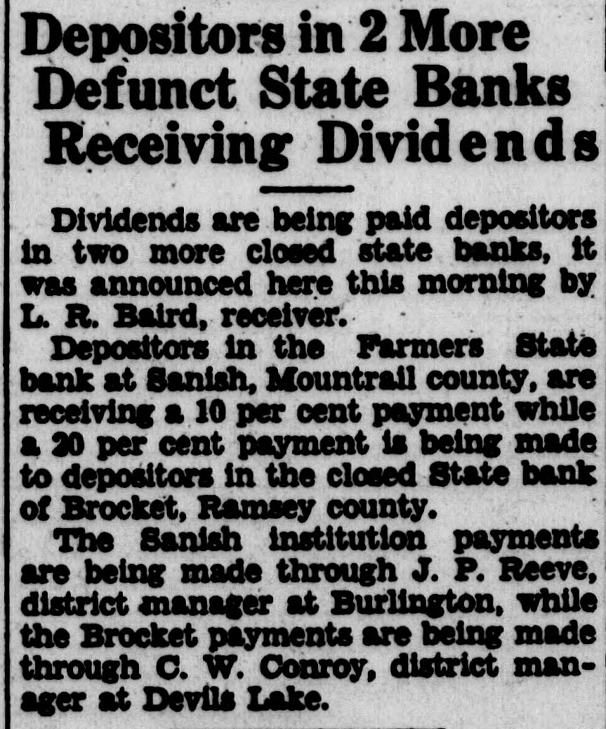 Depositors in 2 More Defunct State Banks Receiving Dividends Dividends are being paid depositors in two more closed state banks, it was announced here this morning by L. R. Baird, receiver. Depositors in the Farmers State bank at Sanish, Mountrail county, are receiving a 10 per cent payment while a 20 per cent payment is being made to depositors in the closed State bank of Brocket, Ramsey county. The Sanish institution payments are being made through J. P. Reeve, district manager at Burlington, while the Brocket payments are being made through C. W. Conroy, district manager at Devils Lake.