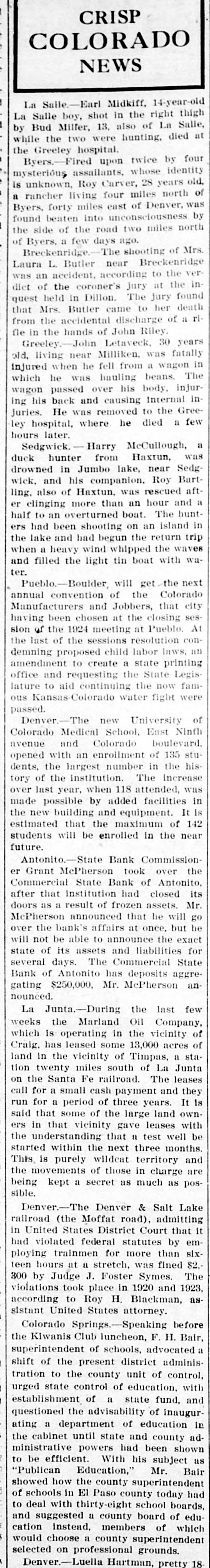 CRISP COLORADO NEWS La Salle.- - Earl Midkiff, 14-year-old shot in the 13. also of by La Bud Salle Milfer, boy, right La died Salle, thigh at while the two were hunting, the Greeley hospital. Byers.-Fired upon twice by four assallants, Roy Carver, 28 years mysterious is unknown, whose north identity old. of a rancher living four miles Byers, forty miles east of Denver, was found beaten into unconsciousness by the side of the road two miles north of Byers, a few days ago. Breckenridge.-The shooting of Mrs. Laura L. Butler near Breckenridge was an accident, according to the verdiet of the coroner's jury at the inquest held in Dillon. The jury found that Mrs. Butler came to her death from the accidental discharge of a rifle in the hands of John Riley, Greeley.-John Letaveck, 30 years old, living near Milliken, was fatally when he fell from a in he was hauling injured which body, beans. wagon injur- The wagon passed over his back and causing inHe was removed to ing juries. his internal the Gree- few ley hospital, where he died a hours later. Sedgwick Harry McCullough, a from in Jumbo near drowned duck hunter lake, Haxtun, Roy Sedg- Bart- was and his companion, also of Haxtun, was more than an a wick, er ling. clinging rescued hour and afthalf to an overturned boat. The hunters had been shooting on an island in the lake and had begun the return trip when a heavy wind whipped the waves and filled the light tin boat with water. Pueblo.-Boulder will get the next annual convention of the Colorado Manufacturers and Jobbers, that city having been chosen at the closing session of the 1924 meeting at Pueblo. At the last of the sessions resolution condemning proposed child labor laws, an amendinent to create a state printing office and requesting the State Legislature to aid continuing the now famous Kansas-Colorado water fight were passed. Denver.-The new University of Colorado Medical School, East Ninth Colorado with an opened avenue and enroilment number in of boulevard. the 135 stu- hisdents, the largest of the institution. over last when 118 was tory year, attended, The facilities increase in made possible by added the new building and equipment. It Is estimated that the maximum of 142 students will be enrolled in the near future. Antonito.-State Bank Commission er Grant McPherson took over the Commercial State Bank of Antonito, institution had closed its result of frozen announced go McPherson doors after that as a that assets. he will Mr. over the bank's affairs at once. but he will not be able to announce the exact state of its assets and liabilities for several days. The Commercial State Bank of Antonito has deposits aggregating $250,000. Mr. McPherson announced. La Junta.-During the last few Marland Oil Company, is in the has leased some weeks which Craig. the operating 13,000 vicinity acres of of land in the vicinity of Timpas, a station twenty miles south of La Junta on the Santa Fe railroad. The leases call for a small cash payment and they run for a period of three years. It is said that some of the large land owngave the that a ers understanding in that vicinity test leases well with be within the next three months. is and of are started This, the movements purely wildcat those in territory charge being kept a secret as much as possible. Denver.-The Denver & Salt Lake Moffat road), railroad United (the District Court admitting that in States it had violated federal statutes by employing trainmen for more than sixteen hours at a stretch, was fined $2.300 by Judge J. Foster Symes. The violations took place in 1920 and 1923, according to Roy H. Blackman, assistant United States attorney. Colorado Springs.-Speaking before the Kiwanis Club luncheon, F. H. Bair, superintendent of schools, advocated a shift of the present district administration to the county unit of control, urged state control of education, with of a state fund, and the questioned establishment advisability education of inaugurating a department of in until state county adpowers ministrative the cabinet had and been shown to be efficient. With his subject as "Publican Education," Mr. Bair showed how the county superintendent of In El Paso county today had to with boards, a county eduand schools deal suggested thirty-eight school board of cation instead. members of which would choose a county superintendent selected on professional grounds. Denver.-Luella Hartman, pretty 18