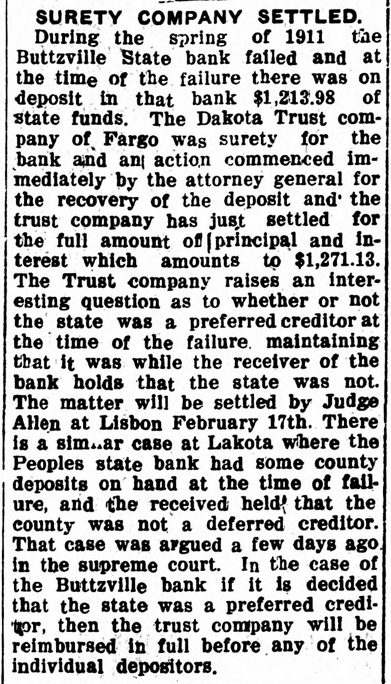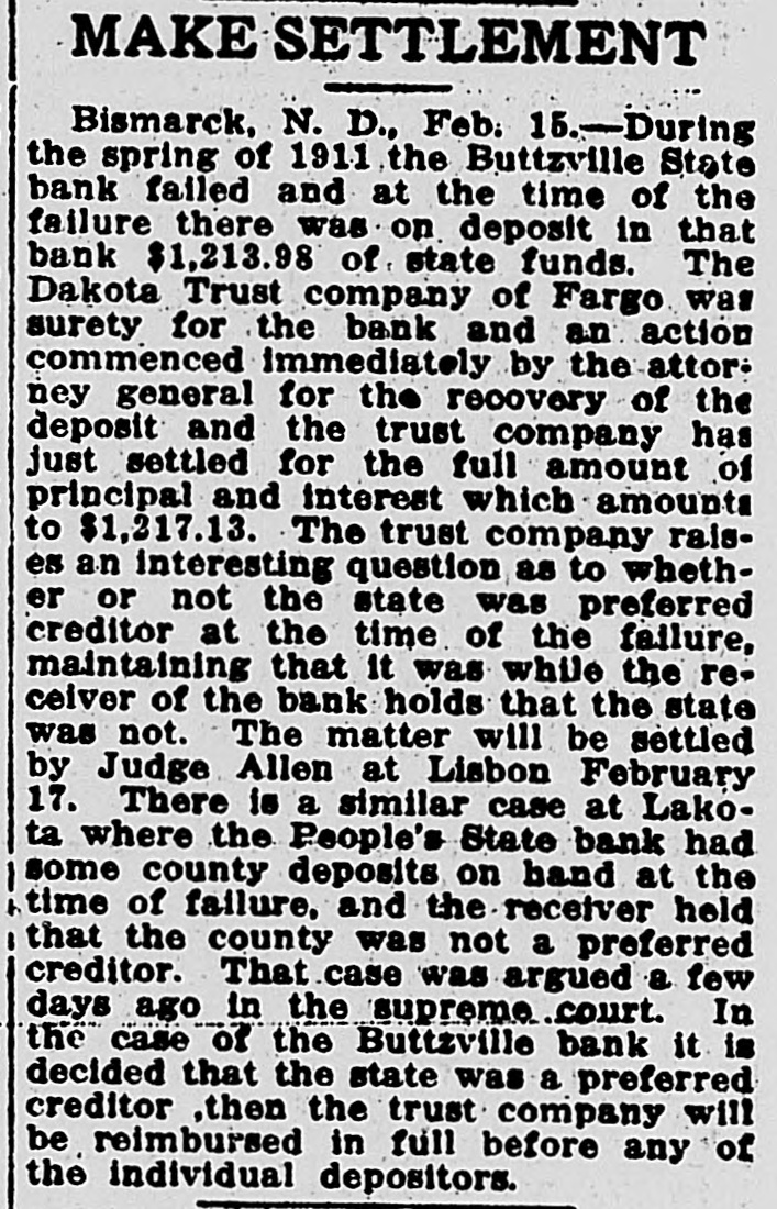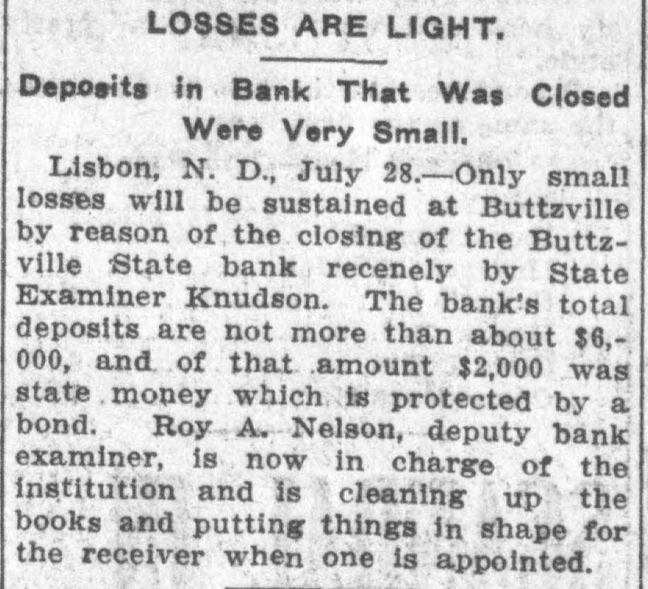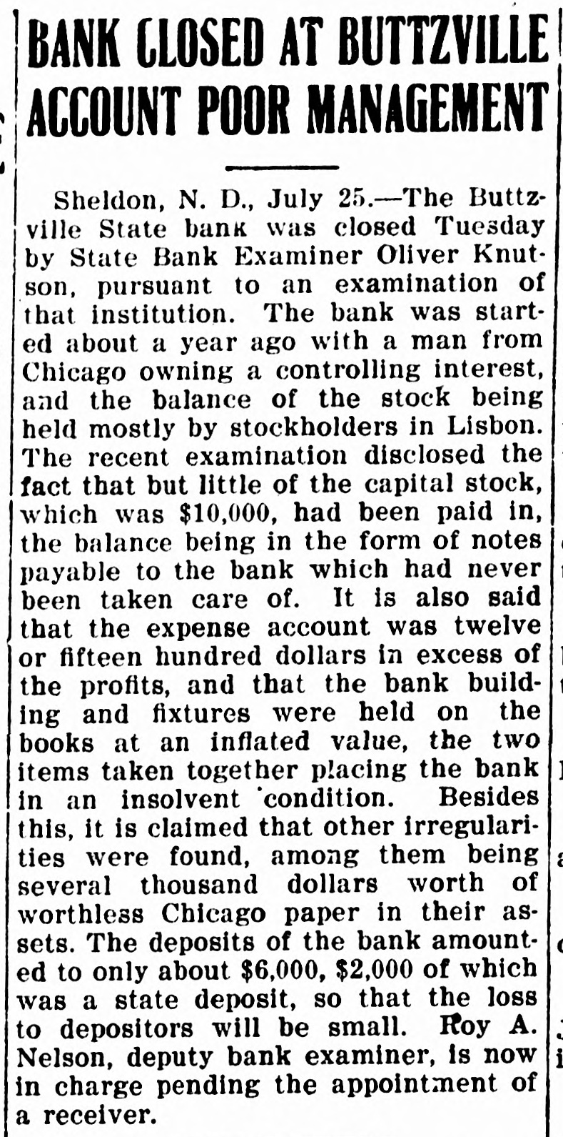 BANK CLOSED AT BUTTZVILLE ACCOUNT POOR MANAGEMENT Sheldon, N. D., July 25.-The Buttzville State bank was closed Tuesday by State Bank Examiner Oliver Knutson, pursuant to an examination of that institution. The bank was started about a year ago with a man from Chicago owning a controlling interest, and the balance of the stock being held mostly by stockholders in Lisbon. The recent examination disclosed the fact that but little of the capital stock, which was $10,000, had been paid in, the balance being in the form of notes payable to the bank which had never been taken care of. It is also said that the expense account was twelve or fifteen hundred dollars in excess of the profits, and that the bank building and fixtures were held on the books at an inflated value, the two items taken together placing the bank in an insolvent condition. Besides this, it is claimed that other irregularities were found, among them being several thousand dollars worth of worthless Chicago paper in their assets. The deposits of the bank amounted to only about $6,000, $2,000 of which was a state deposit, so that the loss to depositors will be small. Roy A. Nelson, deputy bank examiner, is now in charge pending the appointment of a receiver.