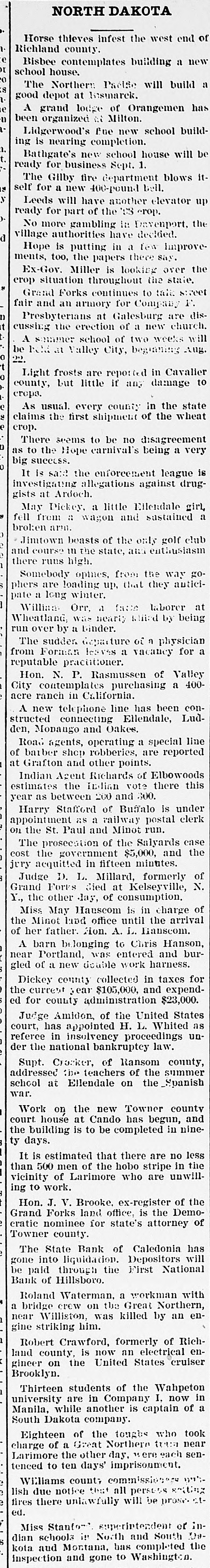 NORTH DAKOTA Horse thieves infest the west end of Richland county. e Bisbee contemplates building a new of school house. o S The Northern Paéise will build a , good depot at lesmarck. e A grand lodge of Orangemen has 1) been organized at Milton. Lidgerwood's fue new school building is nearing completion. t. Bathgate's new school house will be ready for business Sept. 1. The Gilby fire department blows IS self for a new 400-pound bell. y Leeds will have another elevator up ready for part of the 'es crop. No more gambling in Davenport. the d village authorities have decided. Hope is putting in a few Improvements, too, the papers there say. Ex-Gov. Miller is looking over the crop situation throughout the state. Grand Forks continues to talk. sweet fair and an armory for Company F. Presbyterians at Galesburg are disit cussing the erection of a new church. A semmer school of two weeks will be have at Valley City, beginning Aug. o 20 o Light frosts are reported in Cavalier county, but little if any damage to crops. As usual. every county in the state claims the first shipment of the wheat crop. There seems to be no disagreement 0 as to the Hope carnival's being a very big success. It is said the enforcement league is investigating allegations against druggists at Ardoch. May Pickey, a little Ellendale girl, fell from it wagon and sustained a broken arm. Jimtown boasts of the only golf club and course in the state, are enthusiasm there runs high. Somebody opines, from the way gophers are loading up, that they auticipate a long winter. William Orr. a face laborer at Wheatland, was heart; stilled by being run over by a Binder. The sudden. departure of n physician from Forman EVES a vacancy for a reputable practitioner. Hon. N. P. Rasmussen of Valley City contemplates purchasing a 400acre ranch in California. A new telephone line has been constructed connecting Ellendale, Ludden, Monango and Oakes. Road agents, operating a special line of barber shcD robberies, are reported at Grafton and other points. Indian Agent Richards of Elbowoods estimates the Indian vote there this year as between 200 and 300. Harry Stafford of Buffalo is under appointment as a railway postal clerk on the St. Paul and Minot run. The prosecation of the Salyards case cost the government $5,000, and the jery acquitted in fifteen minutes. Judge D. L. Millard, formerly of Grand Forks died at Kelseyville, N. Y., the other day, of consumption. Miss May Hauscom is in charge of the Minot land office until the arrival of her father. Aon. A. i. Hanscom. A barn belonging to Chris Hanson, near Portland, was entered and burgled of a new double work harness. Dickey county collected in taxes for the current year $105,000, and expended for county administration $23,000. Judge Amidon, of the United States court, has appointed H. L. Whited as referee in insolvency proceedings under the national bankruptcy law. Supt. Cracker, of Ransom county, addressed :De teachers of the summer school at Ellendale on the Spanish war. Work on the new Towner county court house at Cando has begun, and the building is to be completed in ninety days. It is estimated that there are no less than 500 men of the hobo stripe in the vicinity of Larimore who are unwilling to work. Hon. J. V. Brooke. ex-register of the Grand Forks land office, is the Democratic nominee for state's attorney of Towner county. The State Bank of Caledonia has gone into liquidation. Depositors will be paid through the First National Bank of Hillsboro. Roland Waterman, a workman with a bridge crew on the Great Northern, near Williston, was killed by an engine striking him. Robert Crawford, formerly of Richland county, is now an electrical engineer on the United States cruiser Brooklyn. Thirteen students of the Wahpeton university are in Company I. now in Manila, while another is captain of a South Dakota company. Eighteen of the toughs who took charge of a Great Northere true near Larimore the other day, " ere each sentenced to ten days' imprisonment. Williams count; commissioners lish due notice that all persess tires there unlawfully will be prose ed. Miss Stanford superiptendent of inin North 09has the dian kota schools aud Montana, and completed South inspection and gone to Washington.