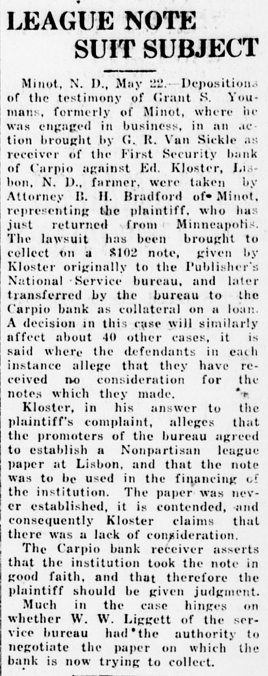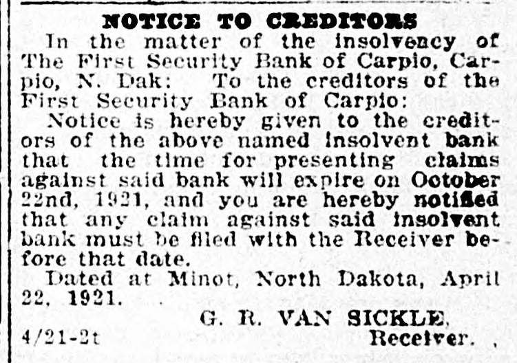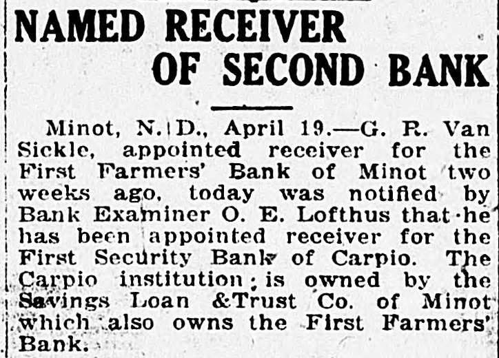 One year old, $12.00; one year old and under two, $20.00; two years old and under three, $30.00; three years old and over, $45.00. Stallion, O. K. Item 9, Cattle Under one year old, $5.00; one year old and over two, $10.00; two years old and under three, $16.00; cows, $25.00; bulls, $30.00. On Items 15, 16, 17 and 18, the following increase or decrease be made: Minot City: Item 15, O. K.; Item 16, Plus 43%; Item 18, Plus 23%. Kenmare City, Item 15, O. K.; Item 16, O. K.; Item 17, Plus 20%; Item 18, O. K. Berthold City, Item 15, Plus 6%; Item 16, O. K.; Item 17, O. K. Carpio Village: Item 15, Plus 56%; Item 16, Plus 70%; Item 17, O. K.; Item 18, O. K. Donnybrook Village: Item 15, O. K.; Item 16, Minus 11%; Item 17, O. K.; Item 18, O. K. Des Laos Village, Item 15, Plus 30%; Item 16, Plus 51%; Item 17, O. K. Douglas Village: Item 15, Minus 20%; Item 16, Minus 20%; Item 17, O. K. Makoti Village: Item 15, Plus 38%; Item 16, O. K.; Item 17, O. K. Ryder Village: Item 15, O. K.; Item 16, Minus 26%; Item 17, O. K.; Item 18, O. K. Sawyer Village: Item 15, O. K.; Item 16, O. K.; Item 17, O. K.; Item 18, C. K. Motion carried. Moved by Com. Spicher, seconded by Com. Haldi, that the following schedule be used in equalizing bank stock in the various banks of Ward County to be in accordance with the tentative assessment as recommended by the State Tax Commisison: Assessment Name of Bank, Location $ 2,500 State Bank of Aurelia, Aurelia 8,437 Bank of Berthold, Berthold State Bank of Berthold, Berthold 5,754 American State Bank, Burlington 18,717 4,180 First State Bank, Burlington 13.836 First National Bank, Carpio First Security Bank, Carpio (In hands of receiver) Farmers State Bank, Des Lacs 3.379 State Bank of Des Lacs, Des Lacs 5,732 Donnybrook State Bank, Donnybrook (In hands of receiver) Peoples' State Bank, Donnybrook 2,379 Citizens State Bank, Douglas 4,836 Douglas State- Bank, Douglas Foxholm State Bank, Foxholm 10,204 3,196 Hartland State Bank, Hartland Farmers & Merchants State Bank, Kenmare (In hands of receiver) First National Bank, Kenmare 17.103 Kenmare National Bank, Kenmare 15,654 2,342 First State Bank, Lone Tree The First National Bank, Makoti 13,654 Reservation State Bank, Makoti Citizens Bank of Minot, Minot 11,000 First Farmers Bank, Minot (In hands of receiver) First International Bank, Minot_ 11,829 Scandinavian American Bank, Minot 5,591 The Second National Bank, Minot 59,937 The Union National Bank, Minot 24,050 Farmers & Merchants State Bank, Niobe 8,215 The First National Bank, Ryder 20,955 First State Bank, Ryder 8,810 First State Bank, Sawyer 10,156 Sawyer State Bank, Sawyer (In hands of receiver) First State Bank, Surrey 4,016 Motion carried. At 3 o'clock it was moved by. Com. Haldi, seconded by Com. Toftner that we adjourn as a Board of Equalization and meet as a Board of County Commissioners. Motion carried. August 3, 1922 The Board met at 2 P. M., as per adjournment, as a Board of Equalization, with the following members present: Commissioners Toftner, Spicher, Haldi and Krantz. Com. Krantz in the chair and Com. Vandenoever absent. Moved by Com. Spicher, seconded by Com. Haldi that the auditor be instructed to reduce the assessed valuation of the Standard Oil Co., in the City of Kenmare, to $2,775, as figures given by the City Assessor. Motion carried. Moved by Com. Spicher, seconded by