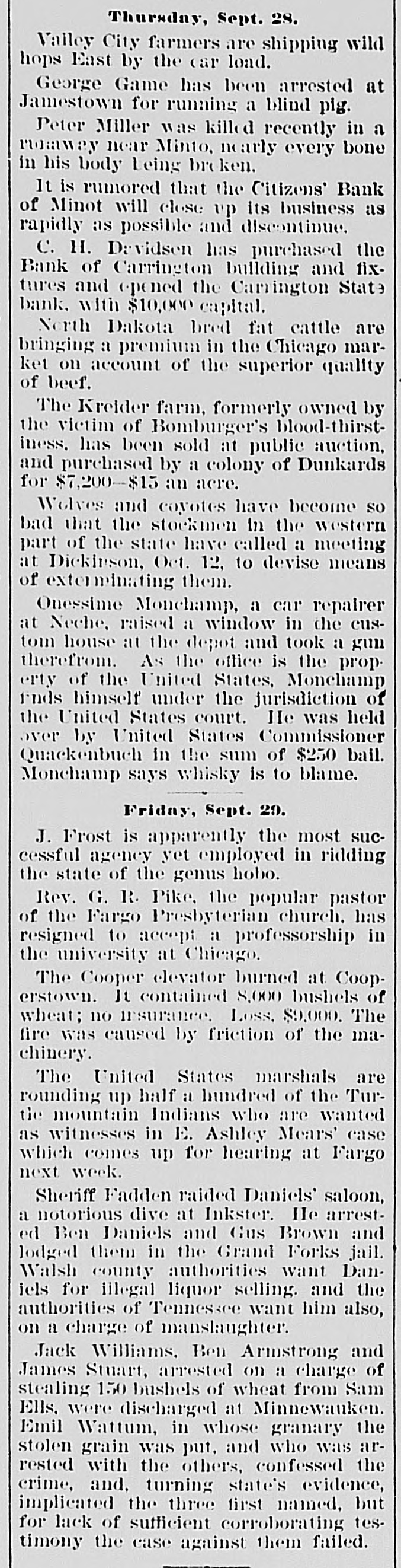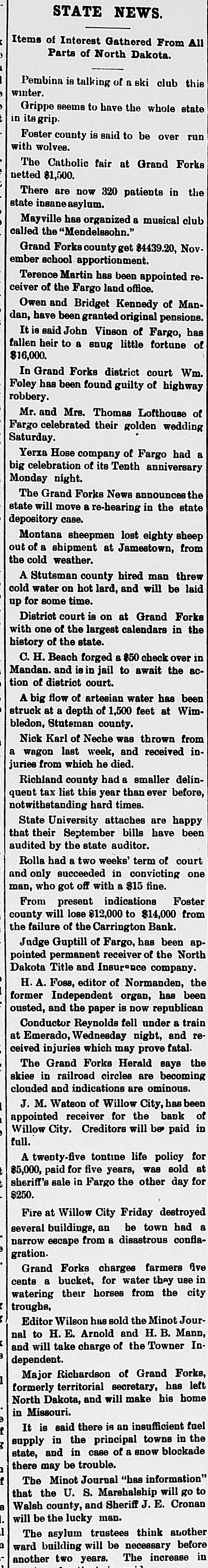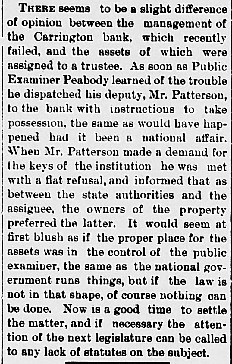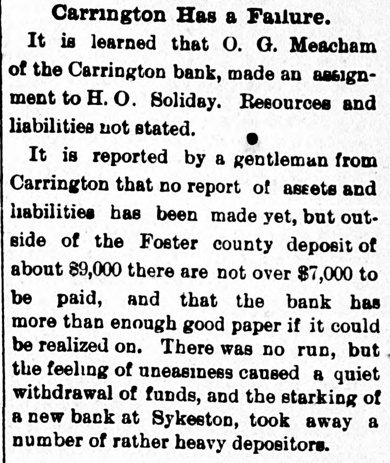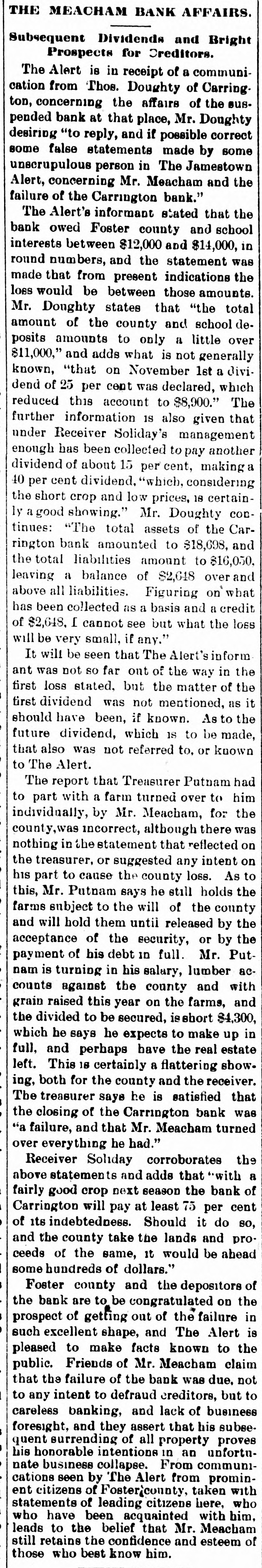 THE MEACHAM BANK AFFAIRS. Subsequent Dividends and Bright Prospects for Creditors. The Alert is in receipt of a communication from Thos. Doughty of Carring. ton, concerning the affairs of the suspended bank at that place, Mr. Doughty desiring "to reply, and if possible correct some false statements made by some unscrupulous person in The Jamestown Alert, concerning Mr. Meacham and the failure of the Carrington bank." The Alert's informant stated that the bank owed Foster county and school interests between $12,000 and $14,000, round numbers, and the statement was made that from present indications the loss would be between those amounts. Mr. Doughty states that "the total amount of the county and school deposits amounts to only a little over $11,000," and adds what is not generally known, "that on November 1st a dividend of 25 per cent was declared, which reduced this account to $8,900." The further information IS also given that under Receiver Soliday's management enough has been collected to pay another dividend of about 15 per cent, making a 40 per cent dividend, "which, considering the short crop and low prices, 18 certainly a good showing." Mr. Doughty continues: "The total assets of the Carrington bank amounted to $18,698, and the total liabilities amount to $16,050. leaving a balance of $2,648 over and above all liabilities. Figuring on what has been collected as a basis and a credit of $2,648. I cannot see but what the loss will be very small, if any." It will be seen that The Alert's inform ant was not so far ont of the way in the first loss stated, but the matter of the first dividend was not mentioned, as it should have been, if known. As to the future dividend, which IS to be made, that also was not referred to. or known to The Alert. The report that Treasurer Putnam had to part with a farm turned over to him individually, by Mr. Meacham, for the county,was incorrect, although there was nothing in the statement that reflected on the treasurer, or suggested any intent on his part to cause the county loss. As to this, Mr. Putnam says he still holds the farms subject to the will of the county and will hold them until released by the acceptance of the security, or by the payment of his debt in full. Mr. Putnam is turning in his salary, lumber accounts against the county and with grain raised this year on the farms, and the divided to be secured, sebort $4,300, which he says he expects to make up in full. and perhaps bave the real estate left. This 18 certainly a flattering show. ing, both for the county and the receiver. The treasurer saye he is satisfied that the closing of the Carrington bank was "a failure, and that Mr. Meacham turned over everything he had." Receiver Soliday corroborates the above statements and adds that "with a fairly good crop next season the bank of Carrington will pay at least 75 per cent of its indebtedness. Should it do so, and the county take the lands and proceeds of the same, it would be ahead e hundreds of dollars." Foster county and the depositors of the bank are to be congratulated on the prospect of getting out of the failure in such excellent shape, and The Alert is pleased to make facts known to the public. Friends of Mr. Meacham claim that the failure of the bank was due, not to any intent to defraud creditors, but to careless banking, and lack of business foresight, and they assert that his subsequent surrending of all property proves his honorable intentions in an unfortnnate business collapse. From communications seen by The Alert from prominent citizens of Foster'county, taken with statements of leading citizens here, who who have been acquainted with him. leads to the belief that Mr. Meacham still retains the confidence and esteem of those who best know him.