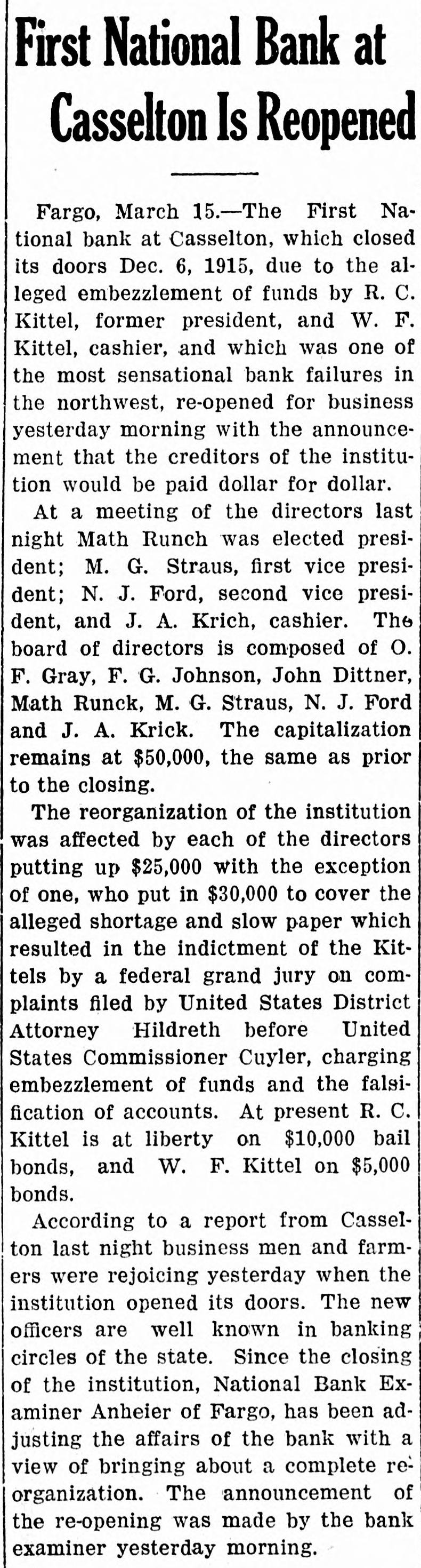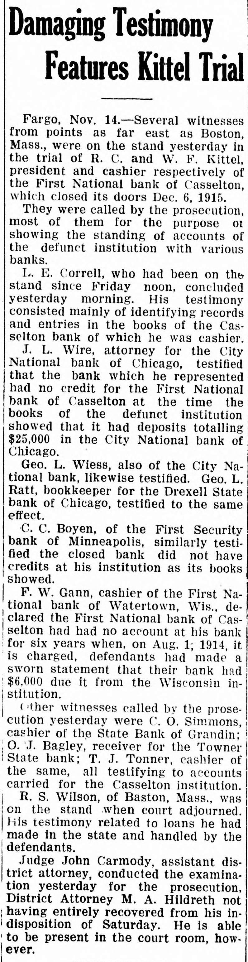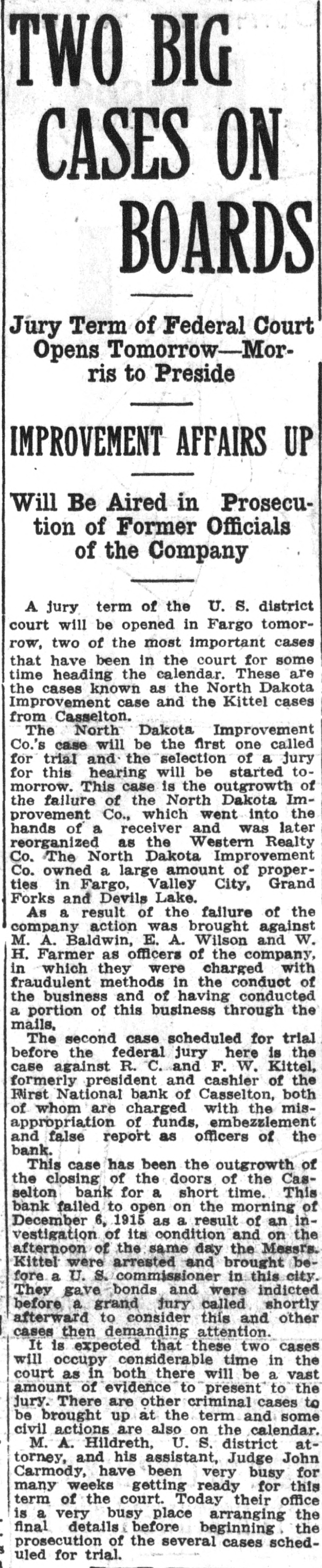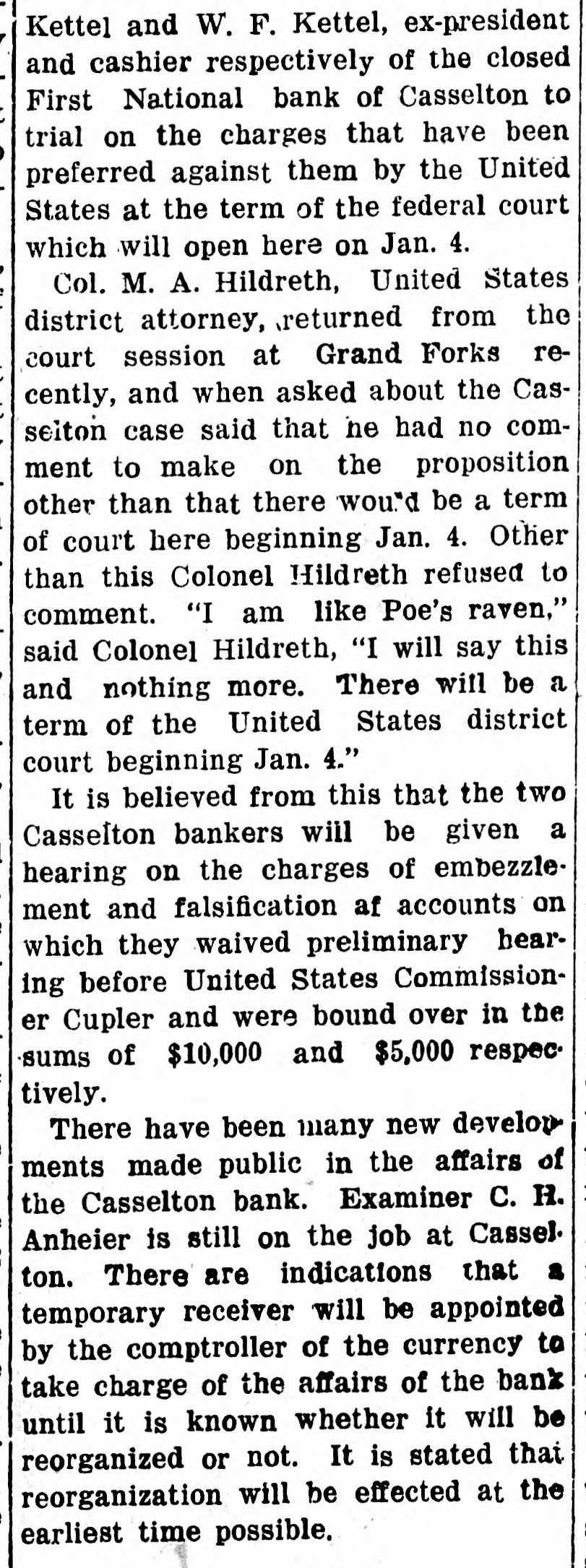 Kettel and W. F. Kettel, ex-president and cashier respectively of the closed First National bank of Casselton to trial on the charges that have been preferred against them by the United States at the term of the federal court which will open here on Jan. 4. Col. M. A. Hildreth, United States district attorney, ,returned from the court session at Grand Forks recently, and when asked about the Casseiton case said that ne had no comment to make on the proposition other than that there wou"d be a term of court here beginning Jan. 4. Other than this Colonel Hildreth refused to comment. "I am like Poe's raven," said Colonel Hildreth, "I will say this and nothing more. There will be a term of the United States district court beginning Jan. 4." It is believed from this that the two Casselton bankers will be given a hearing on the charges of embezzlement and falsification af accounts on which they waived preliminary hearing before United States Commissioner Cupler and were bound over in the sums of $10,000 and $5,000 respectively. There have been many new develop ments made public in the affairs of the Casselton bank. Examiner C. H. Anheier is still on the job at Cassel. ton. There are indications that temporary receiver will be appointed by the comptroller of the currency to take charge of the affairs of the bank until it is known whether it will be reorganized or not. It is stated that reorganization will be effected at the earliest time possible.