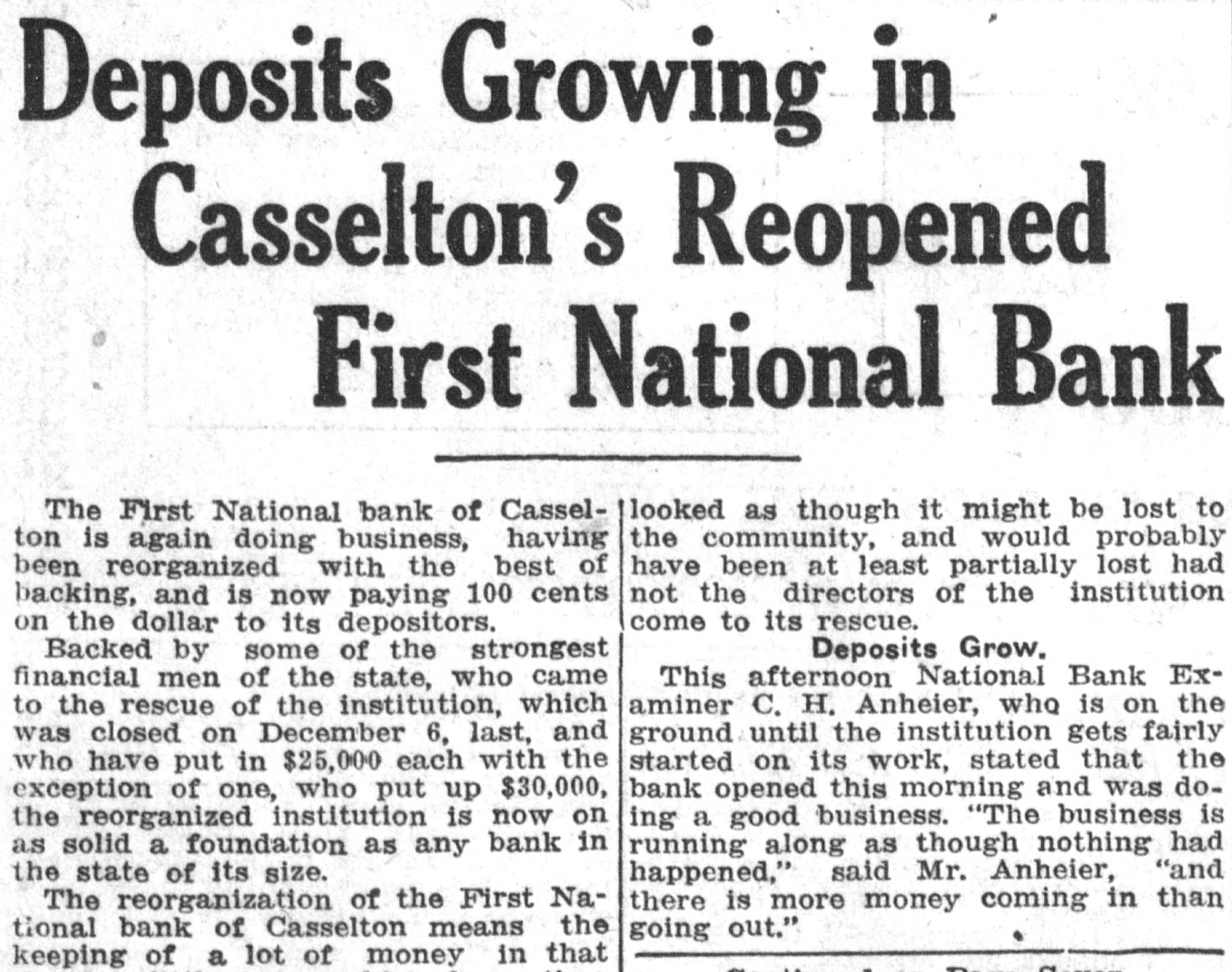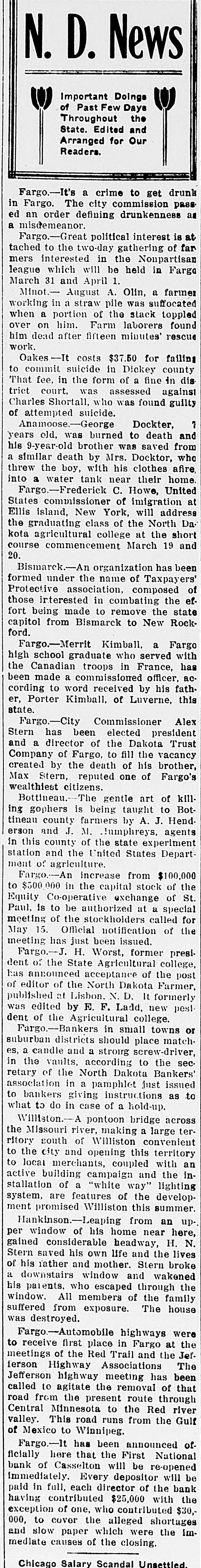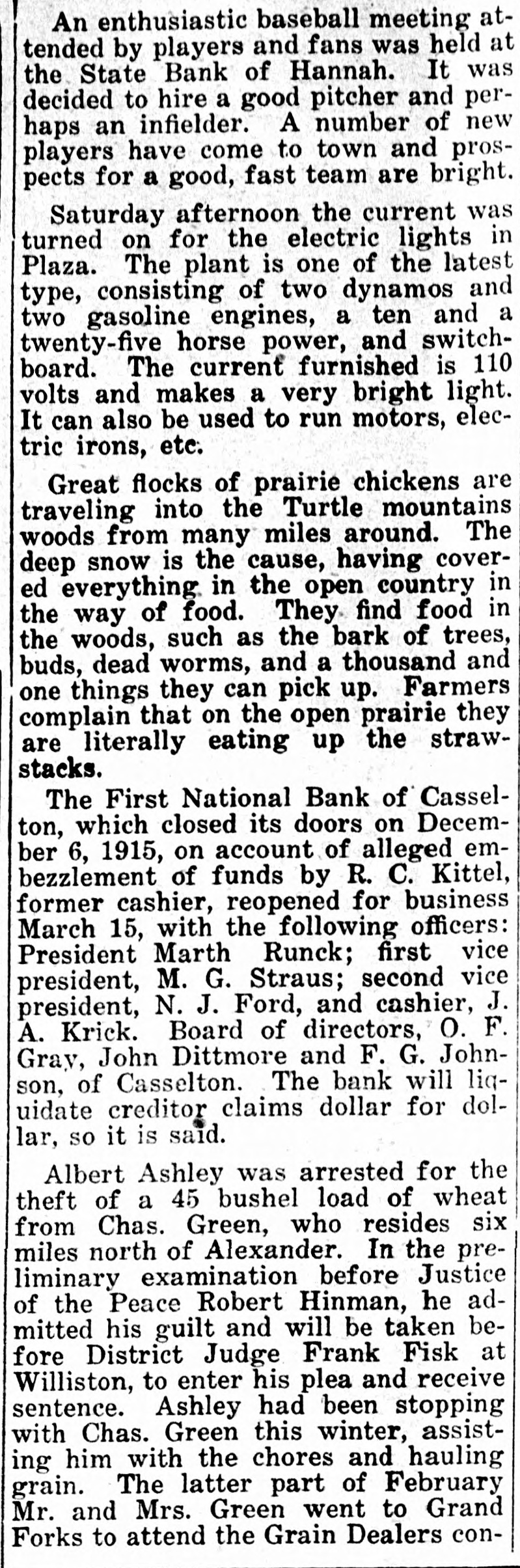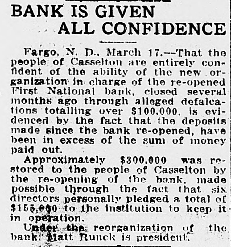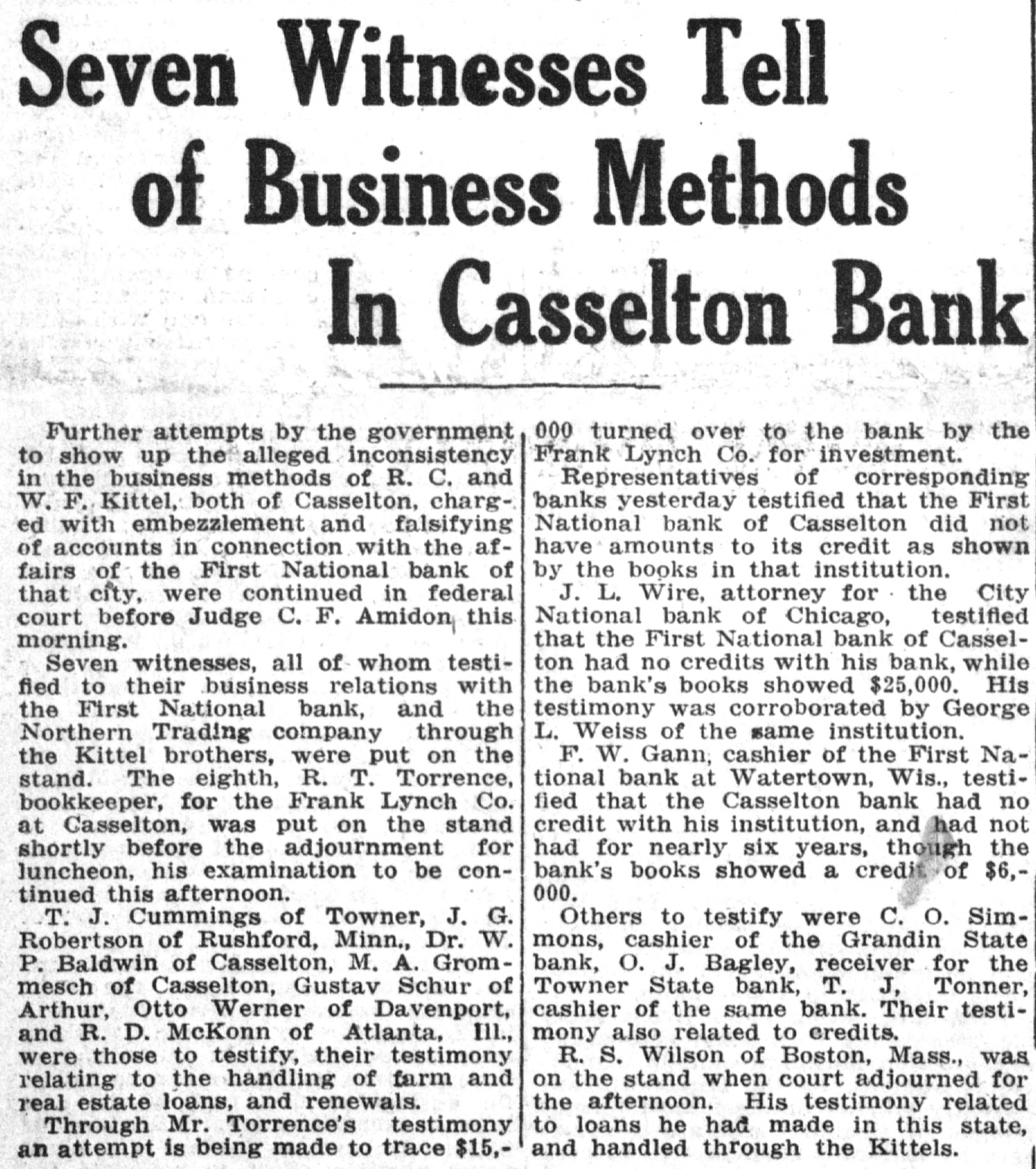 Kettel and W. F. Kettel, ex-president and cashier respectively of the closed First National bank of Casselton to trial on the charges that have been preferred against them by the United States at the term of the federal court which will open here on Jan. 4. Col. M. A. Hildreth, United States district attorney, ,returned from the court session at Grand Forks recently, and when asked about the Casseiton case said that ne had no comment to make on the proposition other than that there wou"d be a term of court here beginning Jan. 4. Other than this Colonel Hildreth refused to comment. "I am like Poe's raven," said Colonel Hildreth, "I will say this and nothing more. There will be a term of the United States district court beginning Jan. 4." It is believed from this that the two Casselton bankers will be given a hearing on the charges of embezzlement and falsification af accounts on which they waived preliminary hearing before United States Commissioner Cupler and were bound over in the sums of $10,000 and $5,000 respectively. There have been many new develop ments made public in the affairs of the Casselton bank. Examiner C. H. Anheier is still on the job at Cassel. ton. There are indications that temporary receiver will be appointed by the comptroller of the currency to take charge of the affairs of the bank until it is known whether it will be reorganized or not. It is stated that reorganization will be effected at the earliest time possible.
