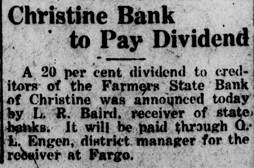 Christine Bank to Pay Dividend A 20 per cent dividend to creditors of the Farmers State Bank of Christine was announced today by L. R. Baird. receiver of state, banks. It will be paid through Q. L. Engen, district manager for the receiver at Fargo.