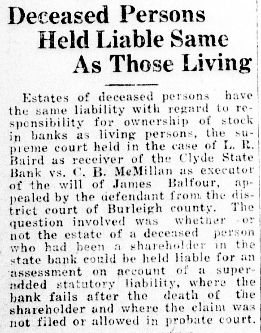# Deceased Persons # Held Liable Same # As Those Living Estates of deceased persons have the same liability with regard to responsibility for ownership of stock in banks as living persons, the supreme court held in the case of L. R. Baird as receiver of the Clyde State Bank vs. C. B. McMillan as executor of the will of James Balfour, appealed by the defendant from the district court of Burleigh county. The question involved was whether or not the estate of a deceased person who had been a shareholder in the state bank could be held liable for an assessment on account of a super-added statutory liability, where the bank fails after the death of the shareholder and where the claim was not filed or allowed in probate court.