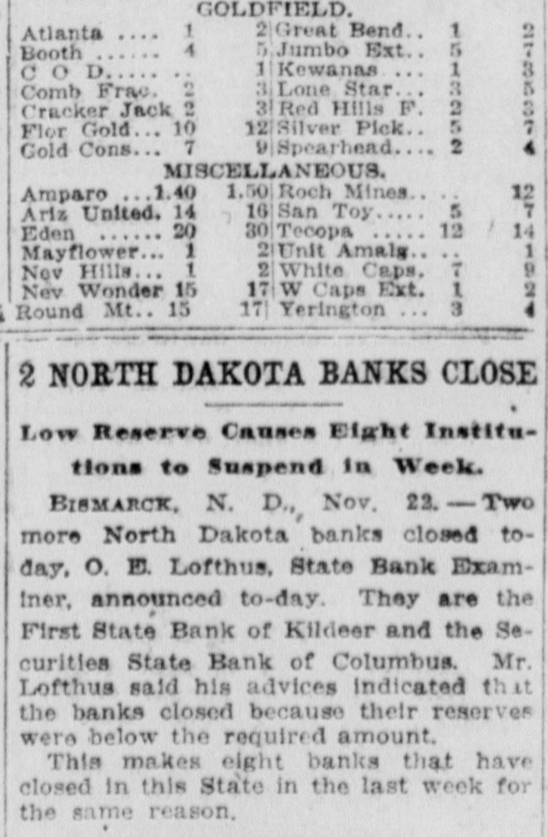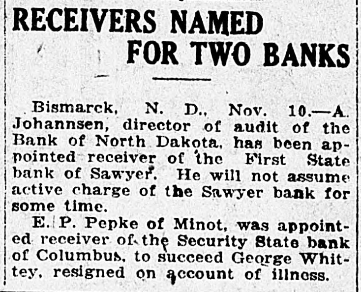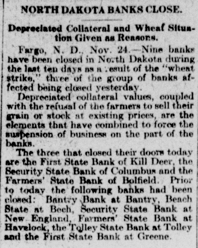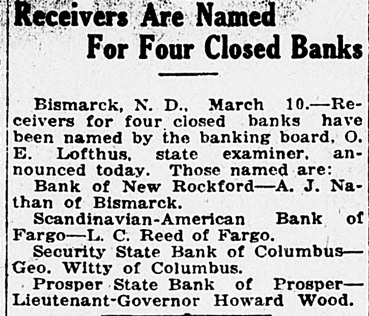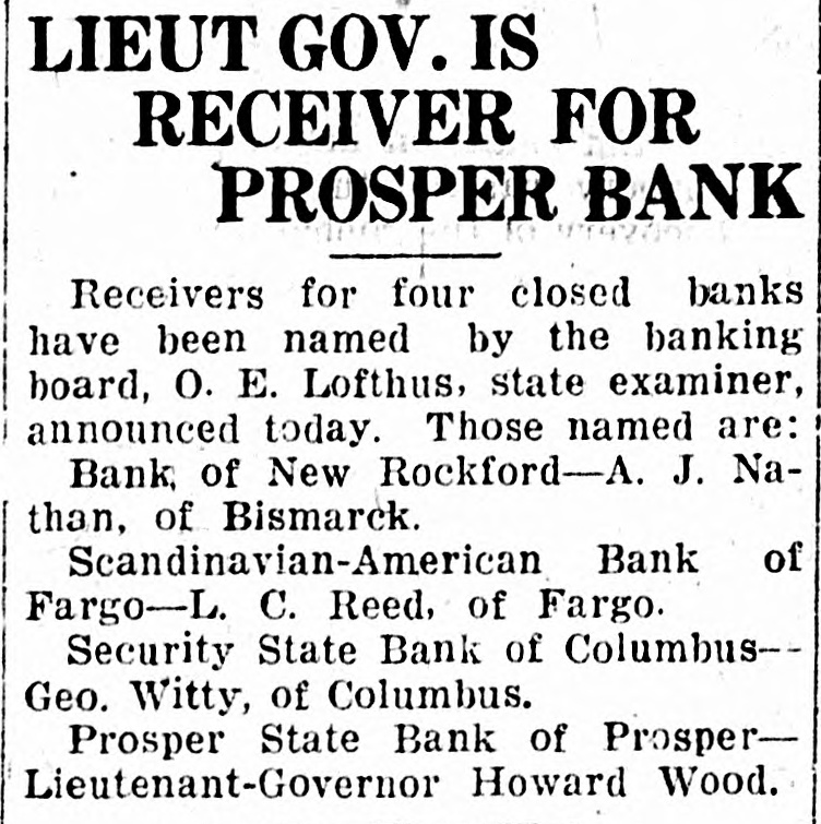 WE EXTEND OUR THANKS BULLETIN The local league organ, after maintaining the silence of the grave on curThe Free Press last week admitted rent affairs for several weeks, makes the loss of $17,688.31 on the Drake up for lost time last week by being mill. Before election the Free Press filled from end to end on dope on how assured its readers that the Drake "Big Bizz" is wrecking the "farmers' mill was making $40,000 per year. program." It is evident that the MACCABEE NOTES been "dope off editor" the job of temporarily, the Free Press and left has the league editor with no choice but to ignore everything that has been Mrs. Elizabeth Dow, of Mandan, going on. District Deputy for the W. B. A. of M. formerly known as Lady MaccaThe Record is again profusely accused of lying. That reminds us that bees, came down last Wednesday and once upon a time the Free Press outworked the town for beneficiary memfit said something about a $100 reward bers last Thursday and Friday. She succeeded in getting a large class of offer if the Record would prove statements that they claimed to be lies. new members, 11 ladies being initiated Friday night. When called, they shut up tight, as After the election and general busiEmmons county people will well remember. This time, the Record is ness session, a social session was held, closing with a fine lunch. charged with lying, but they are more This makes a membership of 23, and circumspect. They simply make the three more pledged to be taken in the charge, and let it go at that. next time they meet. Now, after waiting several weeks, This is a wonderful Benefit Associathe Free Press attacks the list of banks published by the Record Feb. tion, and there isn't any reason why it shouldn't prosper here. 10th. They say Linton banks were not included. Certainly they were not, and for the following reason: Our BANK AT BRADDOCK CLOSES original list was published simply to DOORS show what mammoth deposits were being made in some of the banks of Farmers State Bank, After Four or this state, and the capital and surplus Five Years of Existence, Gives Up. was given to show the comparative Farmers Elevator Reported Hard size of the banks so favored. The LinHit. ton banks were not included because they have not been carrying a lot of The Farmers State Bank of Bradleague paper, and consequently dock has closed its doors. Reports haven't had great favoritism shown received in Linton are to the effect them by the Bank of North Dakota. that the bank had overextended loans However, we will now be glad to acand was no longer able to meet its commodate the local league sheet. In obligations. Being unable to secure fact, it gives up an additional chance further financial backing, the directors to bring home to our readers the vast decided to close voluntarily favoritism shown by the great Bank of North Dakota. The only bank to close in Emmons as yet, the Farmers State Bank had a Here are the figures for the Linton banks, which the Free Press seems to large list of stockhelders. When it was organized, small blocks of stock desire: as of December 3d, the date of were sold to all who would buy in the report, the Braddock neighborhood. Some Liability to sixty or seventy farmers took stock Cap. Surp. Bk. of N. D. City National in varying amounts. Its total capi$35,000 $7,508.59 First National tal amounted to $20,000, and it has 9,256.28 40,000 never been able to build up any rePeoples State 25,000 2,008.89 serve. Its last published statement Now, then, Free Press, compare the was made Dec. 29th, and showed total figures of Linton banks with those deposits of $79,008.29. Of this published in our issue of Feb. 10th, amount, $36,750.97 were time deposits, which seems to have "gotten your and a great share of these accounts goat. We republish a few samples: Busted Banks: doubtless are tied up with the bank's closing. It is said that some $6,000 Liability to belonging to the Farmers' Elevator Cap. Surp. Bk. of N.1 Co., of Braddock, was in the bank Donnybrook State $33,400 $93,534.31 when it closed, thus making that in(A bank now busted, with capital stitution short on ready money. Its and surplus less than either the First loans and discounts amount to $100,National or City Natioanl, of this city, 000. has ten, times as much state funds as O. R. Martini was president, Henry either Linton bank.) Reamann vice president and R. E. $20,000 Tolley State $63,588.85 McCain cashier. Mr. McCain came Security State, Coto Braddock from Mott, where he had lumbus 27,700 50,129.55 been in the machinery business, to Fortuna State 20,000 47,111.06 take charge of the bank when it was (These are all closed banks) first opened. Banks Still Running: Slope County ALLIES AWAIT INAUGURATION State, Amidon 11,500 71,381.90 First State, KloLeague of Nations to Take up U. 8. ten 20,500 65,619.33 Tangle With Harding. (The bank Lofthus was running Paris-The League of Nations counwhen appointed state bank examiner) cil stopped work on matters affecting Farmers' Bank, the United States, pending inauguraRay 12,000 53,375.69 tion of the new president. Receiving And here are Jorgen Olson's three the American protest against the banks, with total capital and surplus awarding of the Mesopotamian manof $100,300, and liabilities to Bank of date to Great Britain, the council deNorth Dakota of $256,582.89. The cided to await a decision by the Allied Supreme Council. The Allied council three Linton banks total capital and at London already had indicated that surplus of $100,000 and their total it would take no action on American liability to Bank of North Dakota is affairs until Senator Harding became $18,733.76. president. Some fine comparisons, aren't they? And we're duly glad that the league MAIL PLANES MAKE RECORD paper called our attention to the possibility of these particular compariFilers in Relay Go From Coast to Coast sons. in 33 Hours 20 Minutes. The Free Press opines that the capiHazelhurst, N. Y.-Eight bags of tal and surplus has