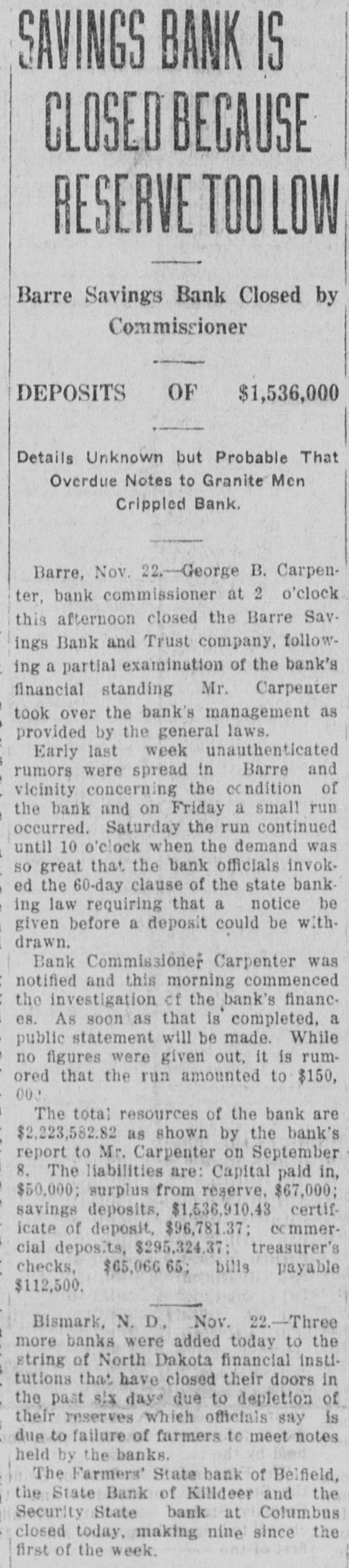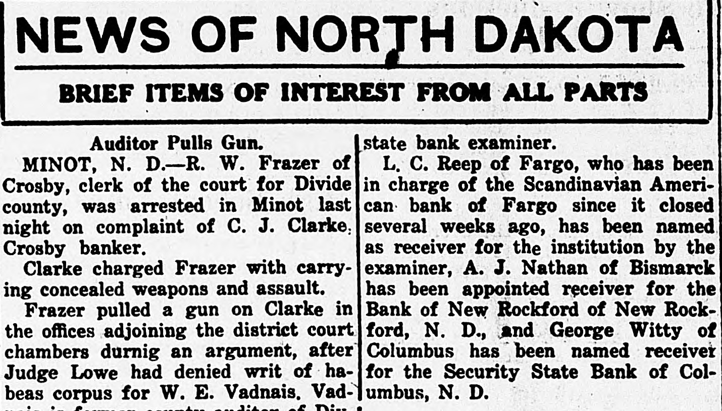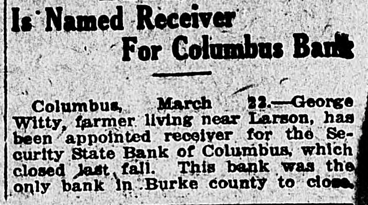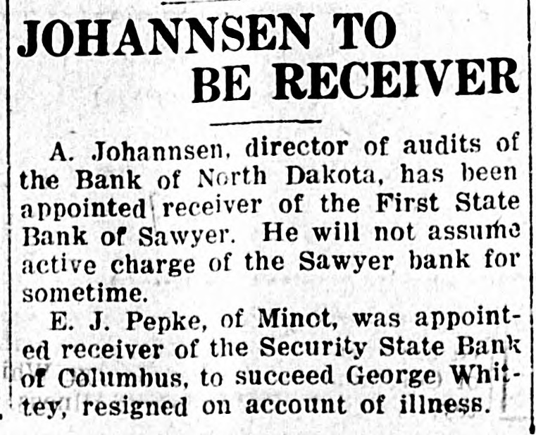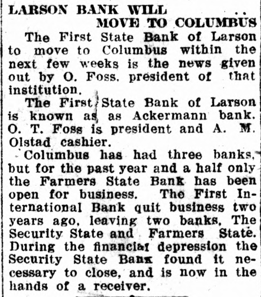WE EXTEND OUR THANKS BULLETIN The local league organ, after maintaining the silence of the grave on curThe Free Press last week admitted rent affairs for several weeks, makes the loss of $17,688.31 on the Drake up for lost time last week by being mill. Before election the Free Press filled from end to end on dope on how assured its readers that the Drake "Big Bizz" is wrecking the "farmers' mill was making $40,000 per year. program." It is evident that the MACCABEE NOTES been "dope off editor" the job of temporarily, the Free Press and left has the league editor with no choice but to ignore everything that has been Mrs. Elizabeth Dow, of Mandan, going on. District Deputy for the W. B. A. of M. formerly known as Lady MaccaThe Record is again profusely accused of lying. That reminds us that bees, came down last Wednesday and once upon a time the Free Press outworked the town for beneficiary memfit said something about a $100 reward bers last Thursday and Friday. She succeeded in getting a large class of offer if the Record would prove statements that they claimed to be lies. new members, 11 ladies being initiated Friday night. When called, they shut up tight, as After the election and general busiEmmons county people will well remember. This time, the Record is ness session, a social session was held, closing with a fine lunch. charged with lying, but they are more This makes a membership of 23, and circumspect. They simply make the three more pledged to be taken in the charge, and let it go at that. next time they meet. Now, after waiting several weeks, This is a wonderful Benefit Associathe Free Press attacks the list of banks published by the Record Feb. tion, and there isn't any reason why it shouldn't prosper here. 10th. They say Linton banks were not included. Certainly they were not, and for the following reason: Our BANK AT BRADDOCK CLOSES original list was published simply to DOORS show what mammoth deposits were being made in some of the banks of Farmers State Bank, After Four or this state, and the capital and surplus Five Years of Existence, Gives Up. was given to show the comparative Farmers Elevator Reported Hard size of the banks so favored. The LinHit. ton banks were not included because they have not been carrying a lot of The Farmers State Bank of Bradleague paper, and consequently dock has closed its doors. Reports haven't had great favoritism shown received in Linton are to the effect them by the Bank of North Dakota. that the bank had overextended loans However, we will now be glad to acand was no longer able to meet its commodate the local league sheet. In obligations. Being unable to secure fact, it gives up an additional chance further financial backing, the directors to bring home to our readers the vast decided to close voluntarily favoritism shown by the great Bank of North Dakota. The only bank to close in Emmons as yet, the Farmers State Bank had a Here are the figures for the Linton banks, which the Free Press seems to large list of stockhelders. When it was organized, small blocks of stock desire: as of December 3d, the date of were sold to all who would buy in the report, the Braddock neighborhood. Some Liability to sixty or seventy farmers took stock Cap. Surp. Bk. of N. D. City National in varying amounts. Its total capi$35,000 $7,508.59 First National tal amounted to $20,000, and it has 9,256.28 40,000 never been able to build up any rePeoples State 25,000 2,008.89 serve. Its last published statement Now, then, Free Press, compare the was made Dec. 29th, and showed total figures of Linton banks with those deposits of $79,008.29. Of this published in our issue of Feb. 10th, amount, $36,750.97 were time deposits, which seems to have "gotten your and a great share of these accounts goat. We republish a few samples: Busted Banks: doubtless are tied up with the bank's closing. It is said that some $6,000 Liability to belonging to the Farmers' Elevator Cap. Surp. Bk. of N.1 Co., of Braddock, was in the bank Donnybrook State $33,400 $93,534.31 when it closed, thus making that in(A bank now busted, with capital stitution short on ready money. Its and surplus less than either the First loans and discounts amount to $100,National or City Natioanl, of this city, 000. has ten, times as much state funds as O. R. Martini was president, Henry either Linton bank.) Reamann vice president and R. E. $20,000 Tolley State $63,588.85 McCain cashier. Mr. McCain came Security State, Coto Braddock from Mott, where he had lumbus 27,700 50,129.55 been in the machinery business, to Fortuna State 20,000 47,111.06 take charge of the bank when it was (These are all closed banks) first opened. Banks Still Running: Slope County ALLIES AWAIT INAUGURATION State, Amidon 11,500 71,381.90 First State, KloLeague of Nations to Take up U. 8. ten 20,500 65,619.33 Tangle With Harding. (The bank Lofthus was running Paris-The League of Nations counwhen appointed state bank examiner) cil stopped work on matters affecting Farmers' Bank, the United States, pending inauguraRay 12,000 53,375.69 tion of the new president. Receiving And here are Jorgen Olson's three the American protest against the banks, with total capital and surplus awarding of the Mesopotamian manof $100,300, and liabilities to Bank of date to Great Britain, the council deNorth Dakota of $256,582.89. The cided to await a decision by the Allied Supreme Council. The Allied council three Linton banks total capital and at London already had indicated that surplus of $100,000 and their total it would take no action on American liability to Bank of North Dakota is affairs until Senator Harding became $18,733.76. president. Some fine comparisons, aren't they? And we're duly glad that the league MAIL PLANES MAKE RECORD paper called our attention to the possibility of these particular compariFilers in Relay Go From Coast to Coast sons. in 33 Hours 20 Minutes. The Free Press opines that the capiHazelhurst, N. Y.-Eight bags of tal and surplus has
