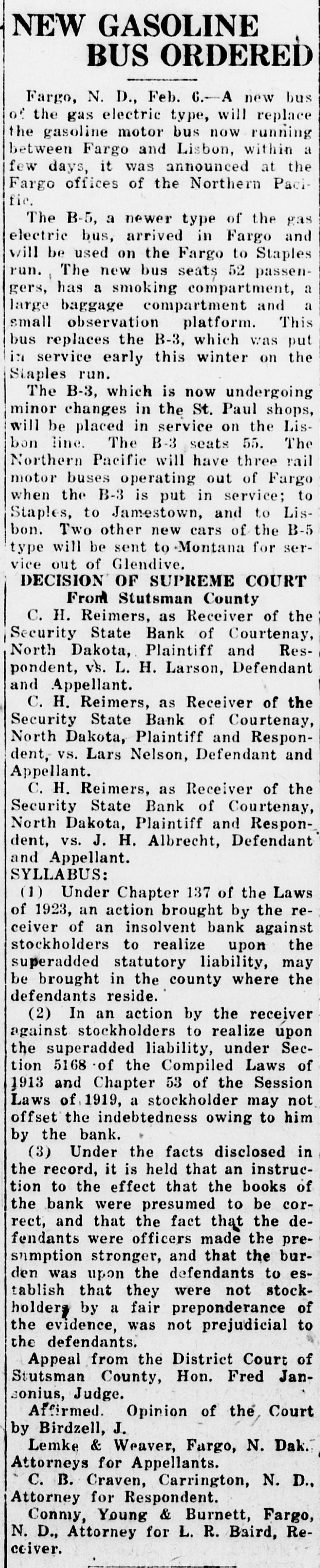 # NEW GASOLINE # BUS ORDERED Fargo, N. D., Feb. 6. A new bus of the gas electric type, will replace the gasoline motor bus now running between Fargo and Lisbon, within a few days, it was announced at the Fargo offices of the Northern Pacific. The B-5, a newer type of the gas electric bus, arrived in Fargo and will be used on the Fargo to Staples run. The new bus seats 52 passengers, has a smoking compartment, a large baggage compartment and a small observation platform. This bus replaces the B-3, which was put in service early this winter on the Staples run. The B-3, which is now undergoing minor changes in the St. Paul shops, will be placed in service on the Lisbon line. The B-3 seats 55. The Northern Pacific will have three rail motor buses operating out of Fargo when the B-3 is put in service; to Staples, to Jamestown, and to Lisbon. Two other new cars of the B-5 type will be sent to Montana for service out of Glendive. # DECISION OF SUPREME COURT From Stutsman County C. H. Reimers, as Receiver of the Security State Bank of Courtenay, North Dakota, Plaintiff and Respondent, vs. L. H. Larson, Defendant and Appellant. C. H. Reimers, as Receiver of the Security State Bank of Courtenay, North Dakota, Plaintiff and Respondent, vs. Lars Nelson, Defendant and Appellant. C. H. Reimers, as Receiver of the Security State Bank of Courtenay, North Dakota, Plaintiff and Respondent, vs. J. H. Albrecht, Defendant and Appellant. SYLLABUS: (1) Under Chapter 137 of the Laws of 1923, an action brought by the receiver of an insolvent bank against stockholders to realize upon the superadded statutory liability, may be brought in the county where the defendants reside. (2) In an action by the receiver against stockholders to realize upon the superadded liability, under Section 5168 of the Compiled Laws of 1913 and Chapter 53 of the Session Laws of 1919, a stockholder may not offset the indebtedness owing to him by the bank. (3) Under the facts disclosed in the record, it is held that an instruction to the effect that the books of the bank were presumed to be correct, and that the fact that the defendants were officers made the presumption stronger, and that the burden was upon the defendants to establish that they were not stockholders by a fair preponderance of the evidence, was not prejudicial to the defendants. Appeal from the District Court of Stutsman County, Hon. Fred Jansonius, Judge. Affirmed. Opinion of the Court by Birdzell, J. Lemke & Weaver, Fargo, N. Dak. Attorneys for Appellants. C. B. Craven, Carrington, N. D., Attorney for Respondent. Conmy, Young & Burnett, Fargo, N. D., Attorney for L. R. Baird, Receiver.