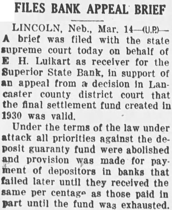 LINCOLN, Neb., Mar. 14-(U.P)A brief was filed with the state supreme court today on behalf of E H. Luikart as receiver for the Superior State Bank, in support of an appeal from a decision In Laneaster county district court that the final settlement fund created in 1930 was valid. Under the terms of the law under attack all priorities against the deposit guaranty fund were abolished and provision was made for payment of depositors in banks that failed later until they received the same per centage as those paid in part until the fund was exhausted.