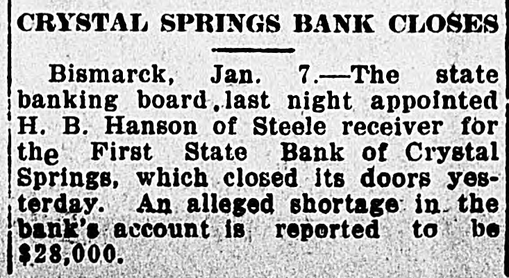 The state banking board... appointed H. B. Hanson of Steele receiver for the First State Bank of Crystal Springs, which closed its doors yesterday.
