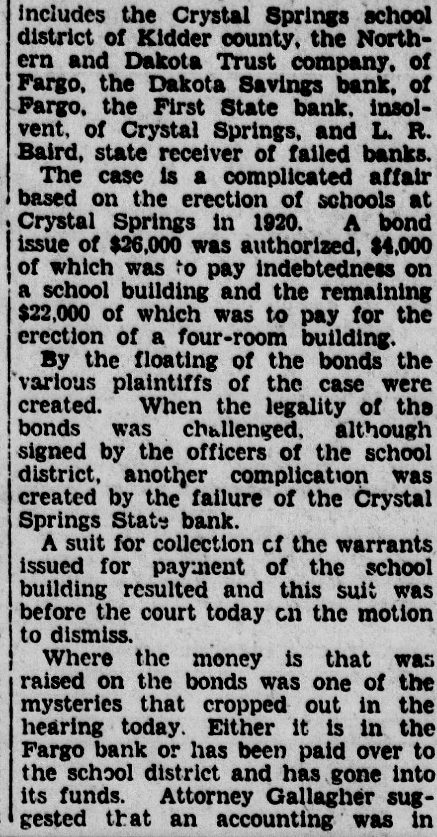 includes the Crystal Springs school district of Kidder county, the Northern and Dakota Trust company. of Fargo, the Dakota Savings bank, of Fargo, the First State bank. insolvent, of Crystal Springs, and L. R. Baird, state receiver of failed banks. The case is a complicated affair based on the erection of schools at bond A Crystal Springs in 1920. issue of $26,000 was authorized, $4,000 of which was to pay indebtedness on a school building and the remaining $22,000 of which was to pay for the erection of a four-room building. By the floating of the bonds the various plaintiffs of the case were created. When the legality of the bonds was challenged, although signed by the officers of the school district, another complication was created by the failure of the Crystal Springs State bank. A suit for collection cf the warrants issued for payment of the school building resulted and this suit was before the court today cn the motion to dismiss. Where the money is that was raised on the bonds was one of the mysteries that cropped out in the hearing today. Either it is in the Fargo bank or has been paid over to the school district and has gone into its funds. Attorney Gallagher suggested that an accounting was in
