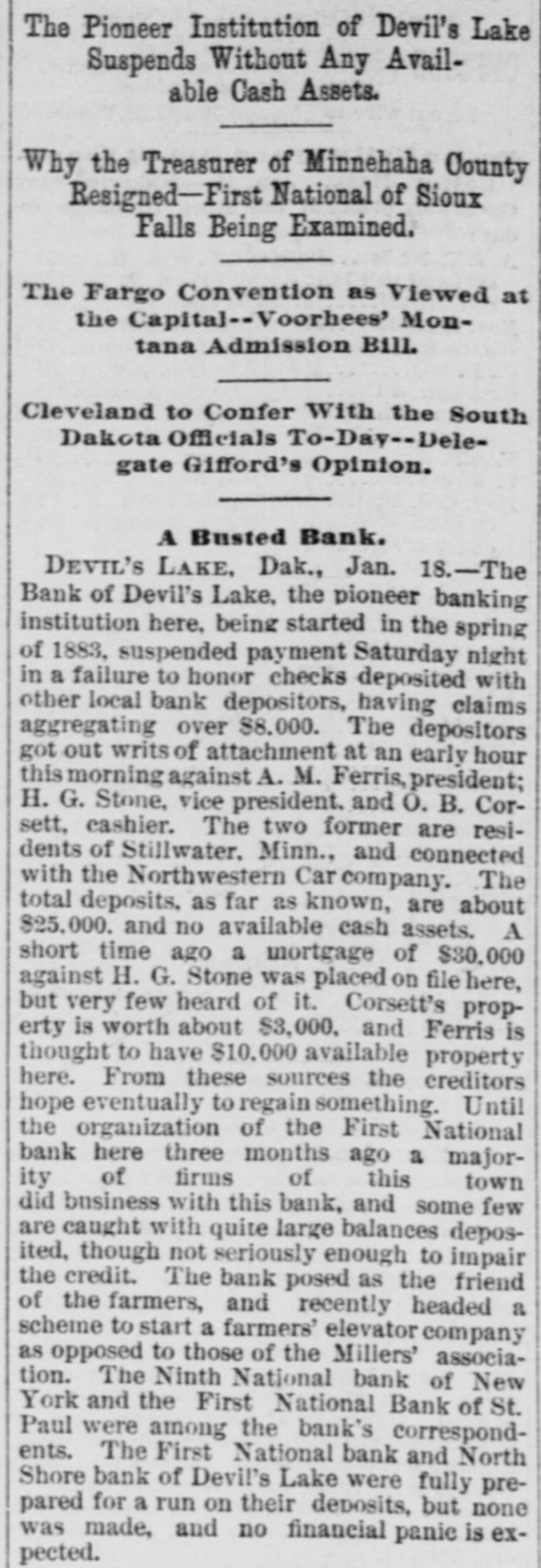 The Pioneer Institution of Devil's Lake Suspends Without Any Available Cash Assets. Why the Treasurer of Minnehaha County Resigned-First National of Sioux Falls Being Examined. The Fargo Convention as Viewed at the Capita]--Voorhees' Montana Admission Bill. Cleveland to Confer With the South Dakota Officials To-Day--Delegate Gifford's Opinion. A Busted Bank. DEVIL'S LAKE, Dak., Jan. 18.-The Bank of Devil's Lake, the pioneer banking institution here, being started in the spring of 1883, suspended payment Saturday night in a failure to honor checks deposited with other local bank depositors, having claims aggregating over $8,000. The depositors got out writs of attachment at an early hour this morning against A. M. Ferris, president; H. G. Stone, vice president. and O. B. Corsett, cashier. The two former are residents of Stillwater. Minn., and connected with the Northwestern Car company. The total deposits, as far as known, are about $25,000. and no available cash assets. A short time ago a mortgage of $30,000 against H. G. Stone was placed on file here, but very few heard of it. Corsett's property is worth about $3,000, and Ferris is thought to have $10,000 available property here. From these sources the creditors hope eventually to regain something. Until the organization of the First National bank here three months ago a majority of firms of this town did business with this bank, and some few are caught with quite large balances deposited, though not seriously enough to impair the credit. The bank posed as the friend of the farmers, and recently headed a scheme to start a farmers' elevator company as opposed to those of the Millers' association. The Ninth National bank of New York and the First National Bank of St. Paul were among the bank's correspondents. The First National bank and North Shore bank of Devil's Lake were fully prepared for a run on their deposits, but none was made, and no financial panie is expected.