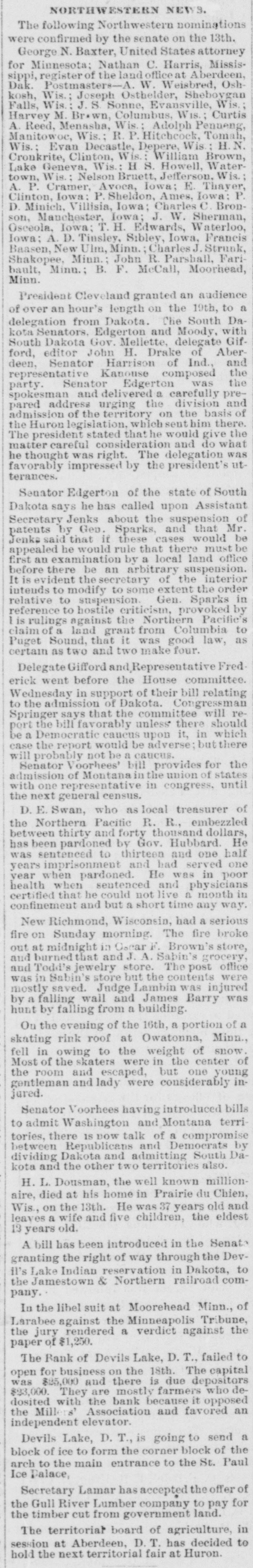 Wis.; Evan Decastle, Depere, Wis H.N. Cronkrite, Clinton, Wis.: William Brown, Lake Geneva, Wis.: H S. Howell, Watertown, Wis.: Nelson Bruett, Jefferson. Wis.: A. P. Cramer, Avoca, Iowa; E. Thayer, Clinton, Iowa: P. Sheldon, Ames, Iowa: P. D. Minich, Villisia, Iowa; Charles C. Bronson, Manchester, Iowa; J. W. Sherman, Osceola, Iowa; T. H. Edwards, Waterloo, Iowa; A. D. Tinsley, Sibley, Iowa, Francis Baasen, New Ulm, Minn. Charles J. Strunk, Shakopee, Minn.: John R. Parsball, Faribault, Minn.; B. F. McCall, Moorhead, Minn. President Cleveland granted an audience of over an hour's length on the 19th, to a delegation from Dakota. The South Dakota Senators. Edgerton and Moody, with South Dakota Gov. Mellette, delegate Gifford, editor John H. Drake of Aberdeen, Senator Harrison of Ind., and representative Kanouse composed the party. Senator Edgerton was the spokesman and delivered a carefully prepared address urging the division and admission of the territory on the basis of the Huron legislation, which sent there. The president stated that he would give the matter careful consideration and do what he thought was right. The delegation was favorably impressed by the president's utterances. Senator Edgerton of the state of South Dakota says he has called upon Assistant Secretary Jenks about the suspension of patents by Gen. Sparks, and that Mr. Jenks said that if these cases would be appealed he would rule that there must be first an examination by a local land office before there be an arbitrary suspension. It is evident the secretary of the interior intends to modify to some extent the order relative to suspension Gen. Sparks in reference to hostile criticism, provoked by I is rulings against the Northern Pacific's claim of a land grant from Columbia to Puget Sound, that it was good law, as certain as two and two make four. Delegate Gifford and Representative Frederick went before the House committee. Wednesday in support of their bill relating to the admission of Dakota. Congressman Springer says that the committee will report the bill favorably unless there should be a Democratic caucus upon it, in which case the report would be adverse; but there will probably not be a caucus. Senator Voorhees' bill provides for the admission of Montana in the union of states with one representative in congress, until the next general census. D. E. Swan, who as local treasurer of the Northern Pacific R. R., embezzled between thirty and forty thousand dollars, has been pardoned by Gov. Hubbard. He was sentenced to thirteen and one half years imprisonment and had served one year when pardoned. He was in poor health when sentenced and physicians certified that he could not live a month in confinement and but a short time any way. New Richmond, Wisconsin, had a serious fire on Sunday morning. The fire broke out at midnight in Oscar F. Brown's store, and burned that and J. A. Sabin's grocery, and Todd's jewelry store. The post office was in Sabin's store but the contents were mostly saved. Judge Lambin was injured by a falling wall and James Barry was hunt by falling from a building. On the evening of the 16th, a portion of a skating rink roof at Owatonna, Minn., fell in owing to the weight of snow. Most of the skaters were in the center of the room and escaped, but one young gentleman and lady were considerably injured. Senator Voorhees having introduced bills to admit Washington and Montana territories, there IS DOW talk of a compromise between Republicans and Democrats by dividing Dakota and admitting South Dakota and the other two territories also. H. L. Dousman, the well known millionaire, died at his home in Prairie du Chien, Wis., on the 13th. He was 37 years old and leaves a wife and five children, the eldest 13 years old. A bill has been introduced in the Senate granting the right of way through the Devil's Lake Indian reservation in Dakota, to the Jamestown & Northern railroad company. In the libel suit at Moorehead Minn., of Larabee against the Minneapolis Tribune, the jury rendered a verdict against the paper of $1,250. The Bank of Devils Lake, D. T., failed to open for business on the 18th. The capital was $85,000 and there is due depositors $93,000. They are mostly farmers who dedosited with the bank because it opposed the Mill 8' Association and favored an independent elevator. Devils Lake, D. T., is going to send a block of ice to form the corner block of the arch to the main entrance to the St. Paul Ice Dalace, Secretary Lamar has accepted the offer of the Gull River Lumber company to pay for the timber cut from government land. The territorial board of agriculture, in session at Aberdeen, D.T. has decided to hold the next territorial fair at Huron.