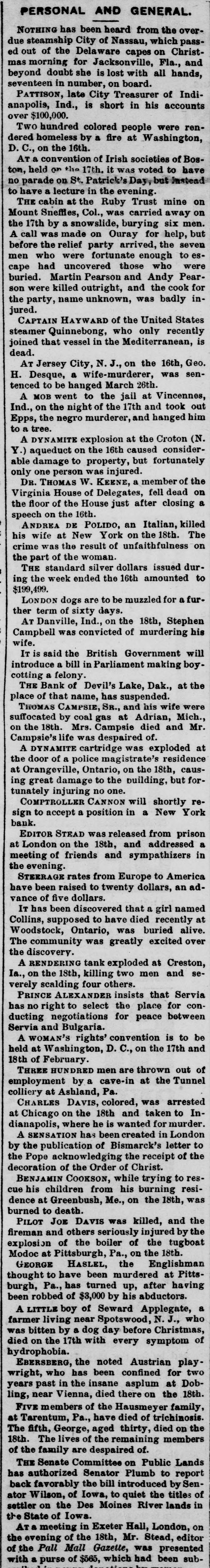 PERSONAL AND GENERAL. NOTHING has been heard from the overdue steamship City of Nassau, which passed out of the Delaware capes on Christmas morning for Jacksonville, Fla., and beyond doubt she is lost with all hands, seventeen in number, on board. PATTISON, late City Treasurer of Indianapolis, Ind., is short in his accounts over $100,000. Two hundred colored people were rendered homeless by a fire at Washington, D.C., on the 16th. AT a convention of Irish societies of Boston, held on the 17th. it was voted to have parade on St. Patrick's Day, but instead to have a lecture in the evening. THE cabin at the Ruby Trust mine on Mount Sneffles, Col., was carried away on the 17th by a snowslide, burying six men. A call was made on Ouray for help, but before the relief party arrived, the seven men who were fortunate enough to escape had uncovered those who were buried. Martin Pearson and Andy Pearson were killed outright, and the cook for the party, name unknown, was badly injured. CAPTAIN HAYWARD of the United States steamer Quinnebong, who only recently is joined that vessel in the Mediterranean, dead. AT Jersey City, N. J., on the 16th, Geo. H. Desque, a wife-murderer, was sentenced to be hanged March 26th. A MOB went to the jail at Vincennes, Ind., on the night of the 17th and took out Epps, the negro murderer, and hanged him to a tree. A DYNAMITE explosion at the Croton (N. Y.) aqueduct on the 16th caused considerable damage to property, but fortunately only one person was injured. DR. THOMAS W. KEENE, a member of the Virginia House of Delegates, fell dead on the floor of the House just after closing a speech on the 16th. ANDREA DE POLIDO, an Italian, killed his wife at New York on the 18th. The crime was the result of unfaithfulness on the part of the woman. THE standard silver dollars issued during the week ended the 16th amounted to $199,499. LONDON dogs are to be muzzled for a further term of sixty days. AT Danville, Ind., on the 18th, Stephen Campbell was convicted of murdering his wife. IT is said the British Government will introduce a bill in Parliament making boy. cotting a felony. THE Bank of Devil's Lake, Dak., at the place of that name, has suspended. THOMAS CAMPSIE, SR., and his wife were suffocated by coal gas at Adrian, Mich., on the 18th. Mrs. Campsie died and Mr. Campsie's li was despaired of. A DYNAMITE cartridge was exploded at the door of a police magistrate's residence at Orangeville, Ontario, on the 18th, causing great damage to the building, but fortunately injuring no one. COMPTROLLER CANNON will shortly resign to accept a position in a New York bank. EDITOR STEAD was released from prison at London on the 18th, and addressed a meeting of friends and sympathizers in the evening. STEERAGE rates from Europe to America have been raised to twenty dollars, an advance of five dollars. IT has been discovered that a girl named Collins, supposed to have died recently at Woodstock, Ontario, was buried alive. The community was greatly excited over the discovery. tank at Creston, on the 18th, killing two men verely Ia., A RENDERING scalding four others. exploded and sePRINCE ALEXANDER insists that Servia has no right to select the place for conducting negotiations for peace between Servia and Bulgaria. A WOMAN'S rights' convention is to be held at Washington, D. C., on the 17th and 18th of February. THREE HUNDRED men are thrown out of employment by a cave-in at the Tunnel colliery at Ashland, Pa. CHARLES DAVIS, colored, was arrested at Chicago on the 18th and taken to Indianapolis, where he is wanted for murder. A SENSATION has been created in London by the publication of Bismarck's letter to the Pope acknowledging the receipt of the decoration of the Order of Christ. BENJAMIN COOKSON, while trying to rescue his children from his burning residence at Greenbush, Me., on the 18th, was burned to death. PILOT JOE Davis was killed, and the fireman and others seriously injured by the explosion of the boiler of the tugboat Modoc at Pittsburgh, Pa., on the 18th. GEORGE HASLEL, the Englishman thought to have been murdered at Pittsburgh, Pa., has turned up, after having been robbed of $3,000 by his abductors. A LITTLE boy of Seward Applegate, a farmer living near Spotswood, N. J., who was bitten by a dog day before Christmas, died on the 17th with every symptom of hydrophobia. EBERSBERG, the noted Austrian playwright, who has been confined for two years past in the insane asplum at Dobling, near Vienna, died there on the 18th. FIVE members of the Hausmeyer family, at Tarentum, Pa., have died of trichinosis. The fifth, George, aged thirty, died on the 18th. The lives of the remaining members of the family are despaired of THE Senate Committee on Public Lands has authorized Senator Plumb to report back favorably the bill introduced by Senator Wilson, of Iowa, to quiet the titles of settler on the Des Moines River lands in the State of Iowa. Ara meeting in Exeter Hall, London, on the of the of Pall Mall was the evening Gazette, 18th, Mr. Stead, presented editor with a purse of $565, which had been sub-