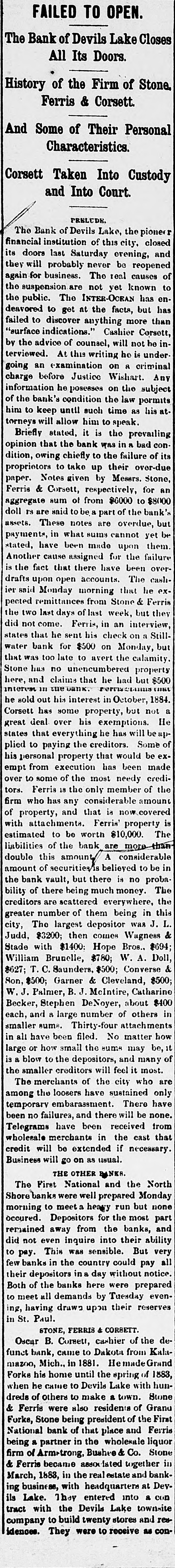 FAILED TO OPEN. The Bank of Devils Lake Closes All Its Doors. History of the Firm of Stone. Ferris & Corsett. And Some of Their Personal Characteristics. Corsett Taken Into Custody and Into Court. PRELUDE. Bank of Devils Lake, the pione institution of this its last Saturday financial The doors evening, city, reopened closed and will probably never be of for business. The not yet they the again suspension are real known causes has en- to the public. The INTER-OCRAN but has deavored to get at the facts, than failed to discover anything more "surface indications." Cashier Corsett, he inby the advice of counsel, will not At this writing he is under an examination on 8 before Justice charge going terviewed. Wishart. criminal subject Any he posessor on the bank's condition the to until such time as of information him the keep law pormits his attorneys will allow him to speak Briefly stated, it is the prevailing that the bank was in a bad con dition, opinion owing chiefly to the failure of its proprietors to take up their over-due Notes given by Mesers. Stone, paper. Ferris & Corsett, respectively, for $8000 an aggregate sum of from $6000 to bank's are said to be part of the These notes are be in what sums cannot payments, assets. doll rs overdue, yet them but have been made upon cause assigned for fact that there have stated, is Another the the been The failure cash overopen accounts. said Monday morning ier drafts upon that & he Ferris expected remittances from Stone they the two last days of last week, but did not come. Ferris, in an interview, Stillstates that he sent his check on but bank for $500 on Monday, was too late to avert water that the calamity. property Stone has no unencumbered here, and claims that he had but $500 interest in me nank. 1884. sold out his interest in October, not has some property, but He a deal over his be great Corsett he exemptions. will states that erything he has Some up- of plied to paying the creditors. be exhis personal property that would made empt from execution has been crediover to some of the most needy the Ferris 18 the only member of tors. firm who has any considerable covered amount of property, and that is now with attachments. Ferris' property The to be worth of the bank are estimated liabilities $10,000. considerable more Hian this amount A in of securities/is believed to bank vault, but there is no amount double the proba- be The of there being much money. are scattered creditors bility everywhere, being in this the greater number of them J. L. The largest depositor was & city, Judd, $3200; then comes Wagness $694; Stade with $1400: Hope Bros. Doll, Brunelle, $780; W. A. T. C. Saunders, $500; William $627; Cleveland, Converse $500; & $500; Garner & B. J. McIntire, $400 Stephen DeNoyer, Son, Becker, W.J. Palmer, about others Catharine in and a large number of sums. Thirty-fo have been filed. No each, in smaller all attachments matter be, how it or how small the eums may of is blow to the depositors, and many smaller creditors will large the feel it who most. merchants of the city are the loosers have embarassment. among temporary The sustained There be have only and there will none. have been that Telegrams been no failures, received cast from wholegale merchants in the credit will be extended if necessary Business will go on as usual. THE OTHER LANKS. The First National and the North Shore banks were well prepared Monday to meet heavy run but none Depositors for the most part away from the remained morning occured. banks, ability and even inquire into their This was sensible. to in the country could pay did few pay. banks not But notice. very all their depositors in day without Both of the banks here were prepared evenmeet all demands by Tuesday to ing, having drawn upon their reserves in St. Paul. STONE, FERRIS & CORBETT Oscar B. Coreett, cashier of the defunct bank, came to Dakota from KalaMich., in 1881. He made Grand 1883, mazon, Forks his home until the spring of when he came to Devils Lake with hundreds of others to make a town. Stone & Ferris were also residents of Granu First Forks, Stone being president of the Ferris National bank of that place and a partner in the firm being Arm-trong, wholesale Co. liquor Stone of Bushee & in became associated together 1883, in the real estate with ing & March, Ferris business, headquarters and at bank- Dev- con They entered into a the Devils tract ils Lake. with Lake townsite and company to build twenty stores residences. They were to receive as con-