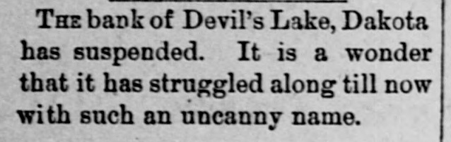 THE bank of Devil's Lake, Dakota has suspended. It is a wonder that it has struggled along till now with such an uncanny name.