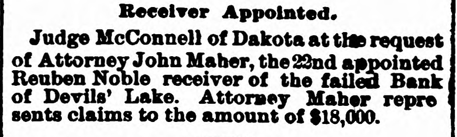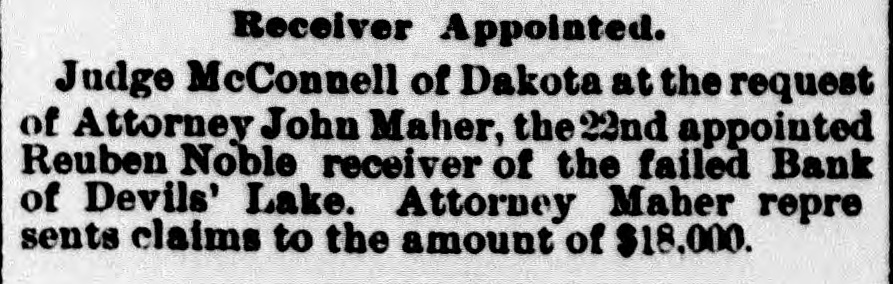 Receiver Appointed. Judge McConnell of Dakota at the request of Attorney John Maher, the 22nd appointed Reuben Noble receiver of the failed Bank of Devils' Lake. Attorney Maher repre sents claims to the amount of $18,000.