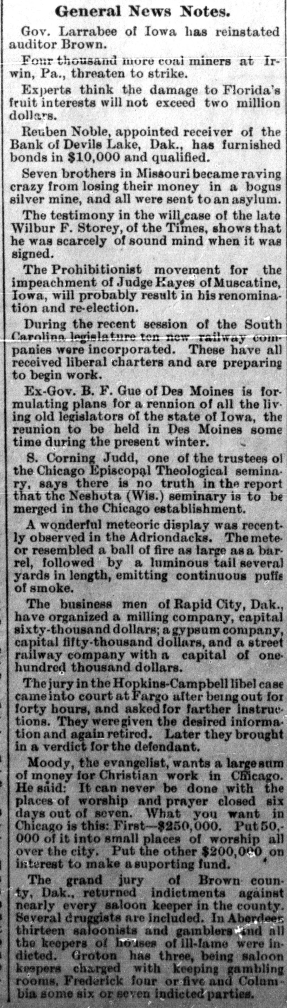 General News Notes. Gov. Larrabee of Iowa has reinstated auditor Brown. Four thousand more coal miners at Irwin, Pa., threaten to strike. Experts think the damage to Florida's fruit interests will not exceed two million dollars. Reuben Noble, appointed receiver of the Bank of Devils Lake, Dak., has furnished bonds in $10,000 and qualified. Seven brothers in Missouri became raving crazy from losing their money in a bogus silver mine, and all were sent to an asylum. The testimony in the will case of the late Wilbur F. Storey, of the Times, shows that he was scarcely of sound mind when it was signed. The Prohibitionist movement for the impeachment of Judge Kayes of Muscatine, Iowa, will probably result in his renomination and re-election. During the recent session of the South Carolina legislature ten new railway companies were incorporated. These have all received liberal charters and are preparing to begin work. Ex-Gov. B. F. Gue of Des Moines is formulating plans for a rennion of all the liv. ing old legislators of the state of Iowa, the reunion to be held in Des Moines some time during the present winter. S. Corning Judd, one of the trustees ol the Chicago Episcopal Theological seminary, says there is no truth in the report that the Neshota (Wis.) seminary is to be merged in the Chicago establishment. A wonderful meteoric display was recently observed in the Adriondacks. The meteor resembled a ball of fire as large asa barrel, followed by a luminous tail several yards in length, emitting continuous puffs of smoke. The business men of Rapid City, Dak., have organized a milling company, capital sixty-thousand dollars; a gypsum company, capital fifty-thousand dollars, and a street railway company with a capital of onehundred thousand dollars. The jury in the Hopkins-Campbell libel case cameinto court at Fargo after being out for forty hours, and asked for farther instruetions. They weregiven the desired information and again retired. Later they brought in a verdict for the defendant. Moody, the evangelist, wants a largesum of money for Christian work in Chicago. He said: It can never be done with the places of worship and prayer closed six days out of seven. What you want in Chicago is this: First-$250,000. Put50,000 of it into small places of worship all over the city. Put the other $200,000 on interest to make a suporting fund. The grand jury of Brown county, Dak., returned indictments against nearly every saloon keeper in the county. Several cruggists are included. In Aberdeen thirteen saloonists and gamblers and all the keepers of houses of ill-fame were indieted. Groton has three, being saloon keepers charged with keeping gambling rooms, Frederick four or five and Columbia some six or seven indicted parties.