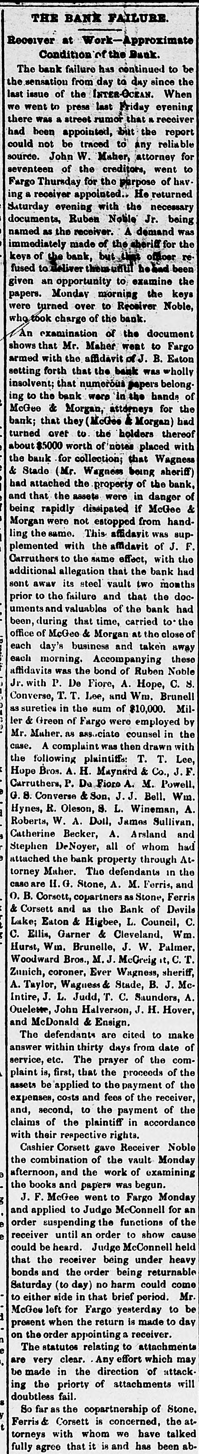 THE BANK FAILURE. Receiver at Work-Approximate Condition of the Bank. The bank failure has continued to be the sensation from day to day since the last issue of the INTER-OCEAN. When we went to press last Friday evening there was a street rumor that a receiver had been appointed, but the report could not be traced to any reliable source. John W. Maher, attorney for of the to for the purpose seventeen Fargo Thursday creditors, went of hav a receiver appointed.. necessary Saturday ing evening with the He returned documents, Ruben Noble Jr. being named as the receiver. A demand was immediately made of the sheriff for the keys of the bank, but think officer re fused to deliver them until beaud been given an opportunity to examine the papers. Monday morning the keys were turned over to Receiver Noble, who took charge of the bank. An examination of the document shows that Mr. Maher went to Fargo armed with the affidavit of J. B. Eaton setting forth that the bank was wholly insolvent; that numerous papers belong ing to the bank were in the hands of McGee & Morgan, attorneys for the bank; that they (McGee & Morgan) had turned over to the holders thereof about $5000 worth of notes placed with the for & Stade bank (Mr. collection; Wagness that being Wagness sheriff) had attached the property of the bank, and that the assets were in danger of being rapidly dissipated if McGee & not was supling the same. Morgan were This estopped affidavit from handwith the F. Carruthers to the same plemented affidavit effect, with of J. the additional allegation that the bank had sent away its steel vault two months prior to the failure and that the doc uments and valuables of the bank had been,during that time, carried to the & at the of business away office each of day's McGee Morgan and taken close each morning. Accompanying these aftidavits was the bond of Ruben Noble Jr. with P. De Fiore, A. Hope, C. S. Converse, T.T. Lee, and Wm. Brunell as sureties in the sum of $10,000. Miller & Greon of Fargo were employed by Mr. Maher. as associate counsel in the case. A complaint was then drawn with the following plaintiff.: T. T. Lee, Hope Bros. A. H. Maynard & Co., F Carruthers, P. Da Fioro A. M. Powell, S. Converse & Son. J. J. Bell. Wm. Hynes, R. Oleson, S. L. Wineman, A. Roberts, W. A. Doll, James Sullivan. A. all Catherine Stephen DeNoyer, Becker, of Arsland whom and had attached the bank property through Attorney Maher. The defendants in the case are H. G. Stone, A. M. Ferris, and O. B. Corsett, copartners as Stone, Ferris & Corsett and as the Bank of Devils Lake; Eaton & Higbee, L. Council, C. C. Ellis, Garner & Cleveland, Wm. Hurst, Win. Brunelle, J. W. Palmer. Woodward Bros., M. J. McGreig it, Zunich, coroner, Ever Wagness, sheriff, A. Taylor, Wagness & Stade, B. J. McIntire, J. L. Judd, T. C. Saunders, A. Ouelette, John Halverson, J. H. Hover, and McDonald & Ensign. The defendants are cited to make within days of The prayer comservice, answer etc. thirty from of the date that the proceeds the be to the payment assets plaint is, first, applied of of the costs and fees of to the payment expenses, and, second, the accordance receiver, of the claims of the plaintiff in with their respective rights. Cashier Corsett gave Receiver Noble the combination of the vault Monday afternoon, and the work of examining the books and papers was begun. McGee went to Fargo Monday and to Judge McConnell for an order the applied suspending functions show of the receiver until an order to cause could be heard. Judge McConnell held that the receiver being under heavy the order being day) no harm come Saturday bonds and (to could returnable Mr side in that brief period. left for be to McGee either Fargo yesterday made to to present when the return is day on the order appointing a receiver. The statutes relating to attachments are very clear. Any effort which may be made in the direction of attack ing the priorty of attachments will doubtless fail. So far as the copartnership of Stone, Corsett is concerned, the atwith whom we torneys Ferris has have been talked fully agree that it is and ab