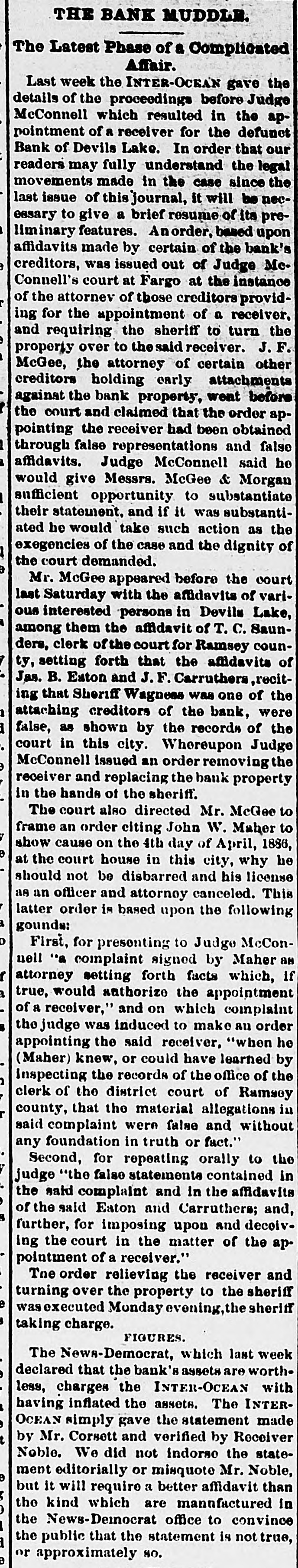 THE BANK MUDDLE. The Latest Phase of a Complicated Affair. Last week the INTER-OCEAN gave the details of the proceedings before Judge McConnell which resulted in the appointment of a receiver for the defunet Bank of Devils Lake. In order that our readers may fully understand the legal movements made in the case since the last issue of this journal, it will be necessary to give a brief resume of its preliminary features. Anorder, based upon affidavits made by certain of the bank's creditors, was issued out of Judge McConnell's court at Fargo at the instance of the attornev of those creditors providing for the appointment of a receiver. and requiring the sheriff to turn the property over to the said receiver. J. F. McGee, the attorney of certain other creditors holding early attachments against the bank property, went before the court and claimed that the order appointing the receiver had been obtained 1 through false representations and false affidavits. Judge McConnell said he would give Messrs. McGee & Morgan sufficient opportunity to substantiate their statement, and if it was substantiated he would take such action as the exegencies of the case and the dignity of the court demanded. Mr. McGee appeared before the court last Saturday with the affidavits of various interested persons in Devils Lake, among them the affidavit of T.C. Saunders, clerk of the court for Ramsey coun7 ty, setting forth that the affidavits of Jas. B. Eaton and J. F. Carruthers reciting that Shoriff Wagness was one of the 1 attaching creditors of the bank, were 1 false, as shown by the records of the court in this city. Whereupon Judge McConnell issued an order removing the receiver and replacing the bank property in the hands of the sheriff. The court also directed Mr. McGee to frame an order citing John W. Maher to show cause on the 4th day of April, 1886, at the court house in this city, why he should not be disbarred and his license as an officer and attornoy canceled. This latter order is based upon the following a gounds: 0 First, for presenting to Judge McConnell "a complaint signed by Maher as r attorney setting forth facts which, if true, would anthorize the appointment of a receiver," and on which complaint the judge was induced to make an order appointing the said receiver, "when he (Maher) knew, or could have learned by Inspecting the records of the office of the ) clerk of the district court of Ramsey county, that the material allegations in said complaint were false and without any foundation in truth or fact." Second, for repeating orally to the judge "the falso statements contained in the said complaint and in the affidavits of the said Eaton and Carruthers; and, further, for imposing upon and decoiving the court in the matter of the ap. pointment of a receiver." Tne order relieving the receiver and turning over the property to the sheriff e was executed Monday evening, the sheriff s taking charge. FIGURES. The News-Democrat, which last week declared that the bank's assets are worthless, charges the INTER-OCEAN with : having inflated the assets. The INTER, OCEAN simply gave the statement made t by Mr. Corsett and verified by Receiver Noble. We did not indorso the statement editorially or misquote Mr. Noble, e but it will require a better affidavit than the kind which are manufactured in the News-Democrat office to convince the public that the statement is not true, or approximately NO.