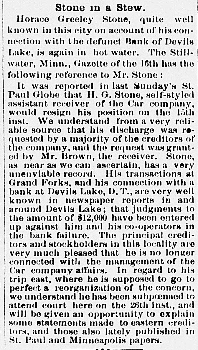 Stone in a Stew. Horace Greeley Stone, quite well known in this city on account of his connection with the defunct Bank of Devils Lake, is again in hot water. The Stillwater, Minn., Gazette of the 16th has the following reference to Mr. Stone: It was reported in last Sunday's St. Paul Globe that H. G. Stone, self-styled assistant receiver of the Car company, would resign his position on the 15th inst. We understand from a very reliable source that his discharge was requested by a majority of the creditors of the company, and the request was granted by Mr. Brown, the receiver. Stone, as near as we can ascertain, has a very unenviable record. His transactions at Grand Forks, and his connection with a bank at Devils Lake, D. T., are very well known in newspaper reports in and around Devils Lake; that judgments to the amount of $12,000 have been entered up against him and his co-operators in the bank failure. The principal creditors and stockholders in this locality are very much pleased that he is no longer connected with the management of the Car company affairs. In regard to his trip east, where he is supposed to go to perfect a reorganization of the concern, we understand he has been subpoenaed to attend court here on the 26th inst., and will be given an opportunity to explain some statements made to eastern creditors, and those also lately published in St. Paul and Minneapolis papers.