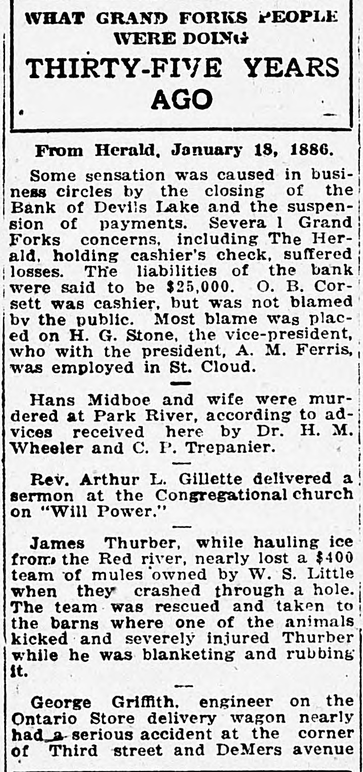 WHAT GRAND FORKS PEOPLE WERE DOING THIRTY-FIVE YEARS AGO From Herald. January 18, 1886. Some sensation was caused in business circles by the closing of the Bank of Devils Lake and the suspension of payments. Severa 1 Grand Forks concerns, including The Herald. holding cashier's check, suffered losses. The liabilities of the bank were said to be $25,000. O. B. Corsett was cashier. but was not blamed by the public. Most blame was placed on H. G. Stone, the vice-president, who with the president, A. M. Ferris, was employed in St. Cloud. Hans Midboe and wife were murdered at Park River, according to advices received here by Dr. H. M. Wheeler and C. P. Trepanier. Rev. Arthur L. Gillette delivered a sermon at the Congregational church on "Will Power." James Thurber, while hauling ice from the Red river, nearly lost a $400 team of mules owned by W. S. Little when they crashed through a hole. The team was rescued and taken to the barns where one of the animals kicked and severely injured Thurber while he was blanketing and rubbing it. George Griffith. engineer on the Ontario Store delivery wagon nearly had serious accident at the corner of Third street and DeMers avenue