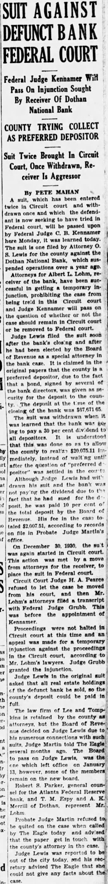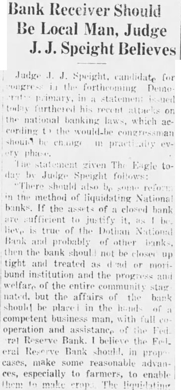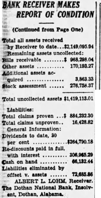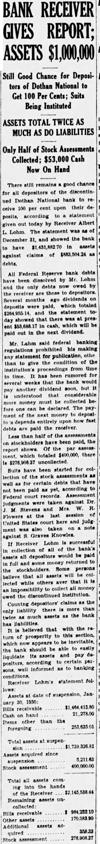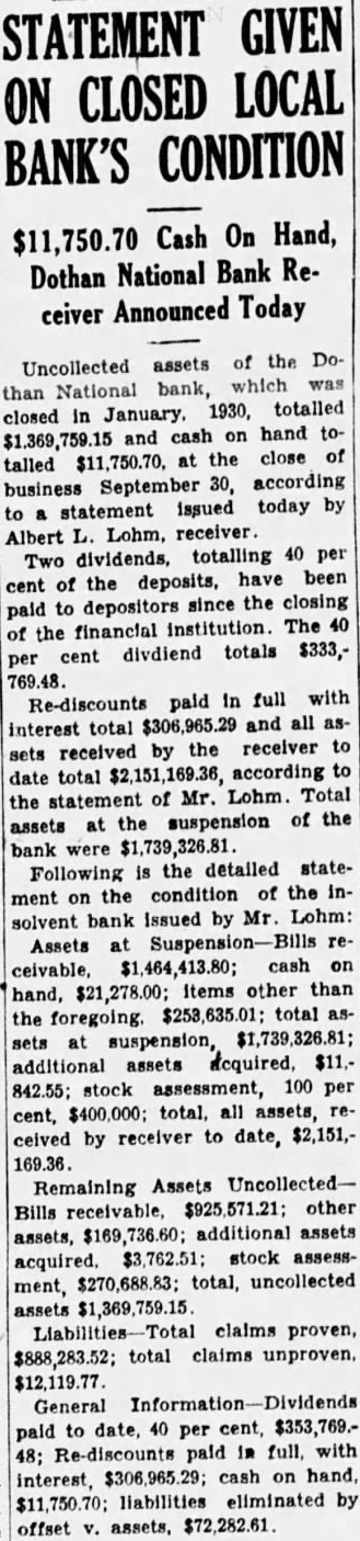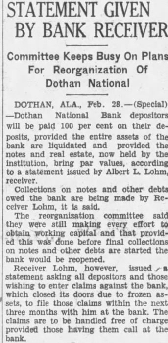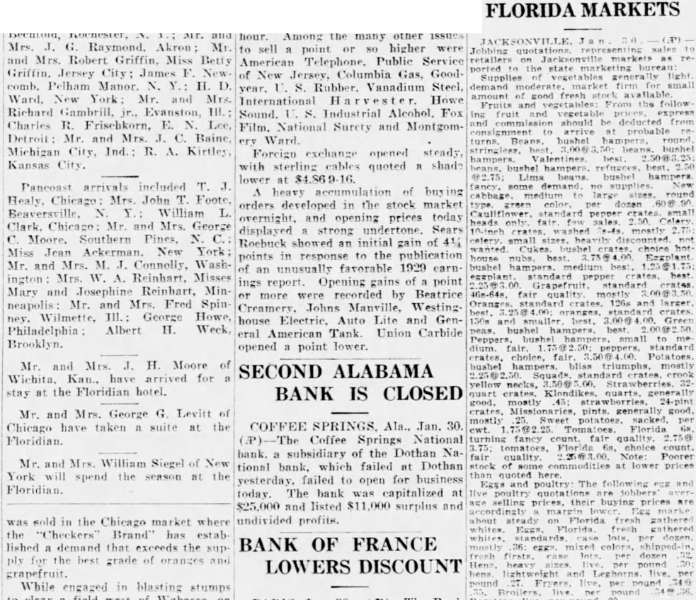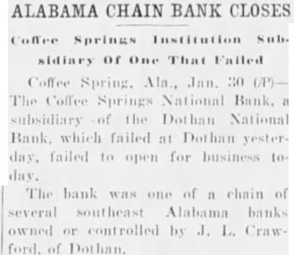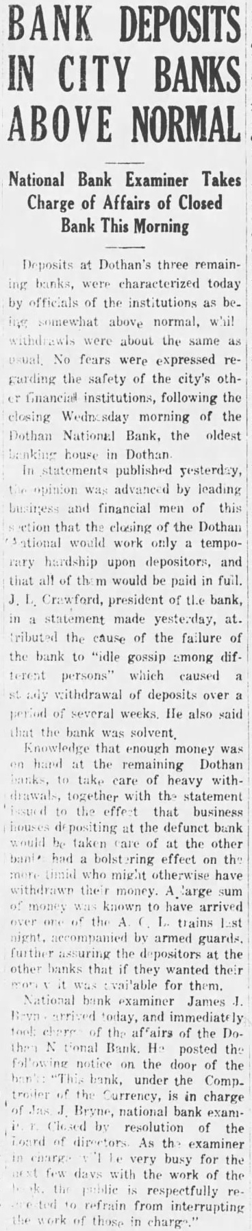 TAKEN FAILS; Depository Closed AUGUSTINE, Commercial Bank Augustine, which had been in existence for about years, failed to open doors for business today. notice posted the door and by President Gilbert stated that the bank suspended for the protection of all depositors alike, and has placed itself in the hands the state banking Officials of the other two banking institutions here stated that they adequately prepared meet any withdrawals by depositors. Lamar, president of the St. Augustine National Bank, that his institution had funds hand amounting to approximately and that additional quarter of million dollars here today from Jacksonville to meet any withdrawals. statement for the commercial bank December last, ed capital stock of $30,000; plus and liabilities and SPRINGS, Ala., Coffee Springs National Bank, subsidiary of the Dothan National Bank which failed at Dothan yesterday, failed to for open business today. The bank capitalized at $25,000 and listed surplus and undivided The Coffee Springs bank one of chain several southeast Alabama banks controllby Crawford who served both institutions president. cashier fee Springs bank, ment the cause of closings. Coffee Springs Geneva county. DOTHAN, Byrne, national bank examinarrived today and took charge affairs of the Dothan National Bank which closed yesterday. Crawford, president of the bank atrributed the closing of the institution to "idle gossip" concerning its financial status and asserted that the bank solvent and able to meet its abligations,' Dothan has three banks. other