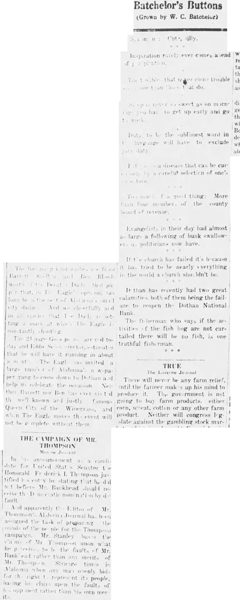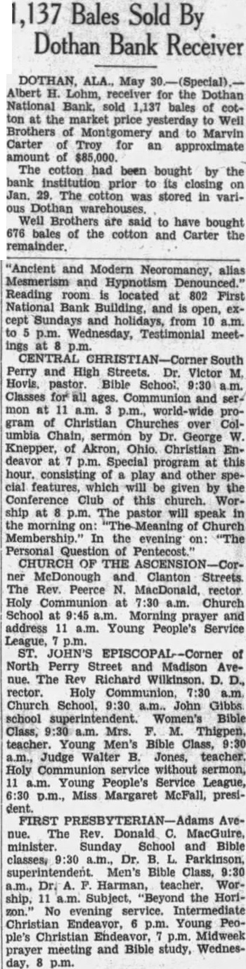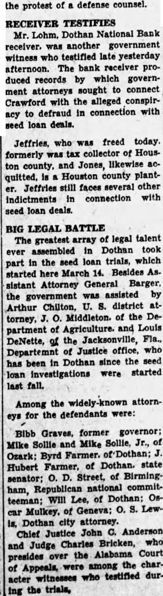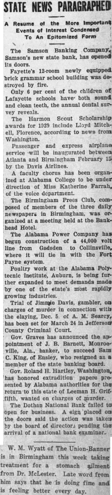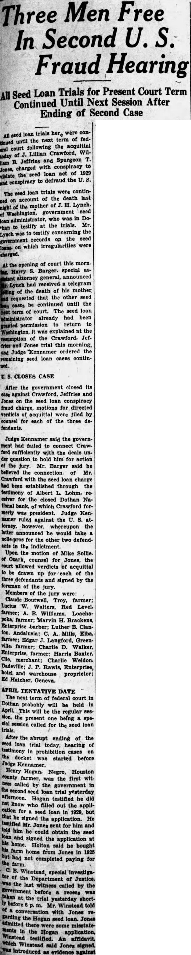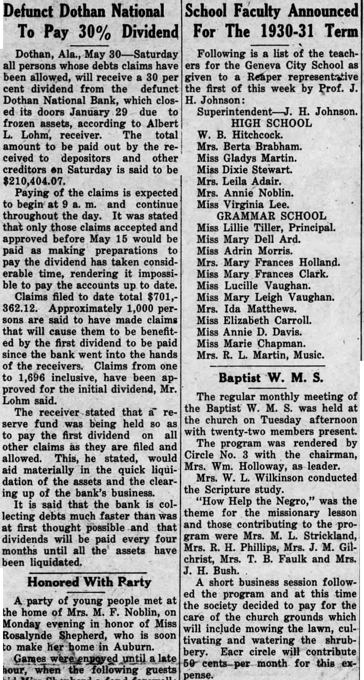 TAKEN FAILS; Depository Closed AUGUSTINE, Commercial Bank Augustine, which had been in existence for about years, failed to open doors for business today. notice posted the door and by President Gilbert stated that the bank suspended for the protection of all depositors alike, and has placed itself in the hands the state banking Officials of the other two banking institutions here stated that they adequately prepared meet any withdrawals by depositors. Lamar, president of the St. Augustine National Bank, that his institution had funds hand amounting to approximately and that additional quarter of million dollars here today from Jacksonville to meet any withdrawals. statement for the commercial bank December last, ed capital stock of $30,000; plus and liabilities and SPRINGS, Ala., Coffee Springs National Bank, subsidiary of the Dothan National Bank which failed at Dothan yesterday, failed to for open business today. The bank capitalized at $25,000 and listed surplus and undivided The Coffee Springs bank one of chain several southeast Alabama banks controllby Crawford who served both institutions president. cashier fee Springs bank, ment the cause of closings. Coffee Springs Geneva county. DOTHAN, Byrne, national bank examinarrived today and took charge affairs of the Dothan National Bank which closed yesterday. Crawford, president of the bank atrributed the closing of the institution to "idle gossip" concerning its financial status and asserted that the bank solvent and able to meet its abligations,' Dothan has three banks. other