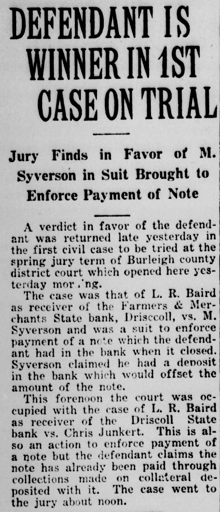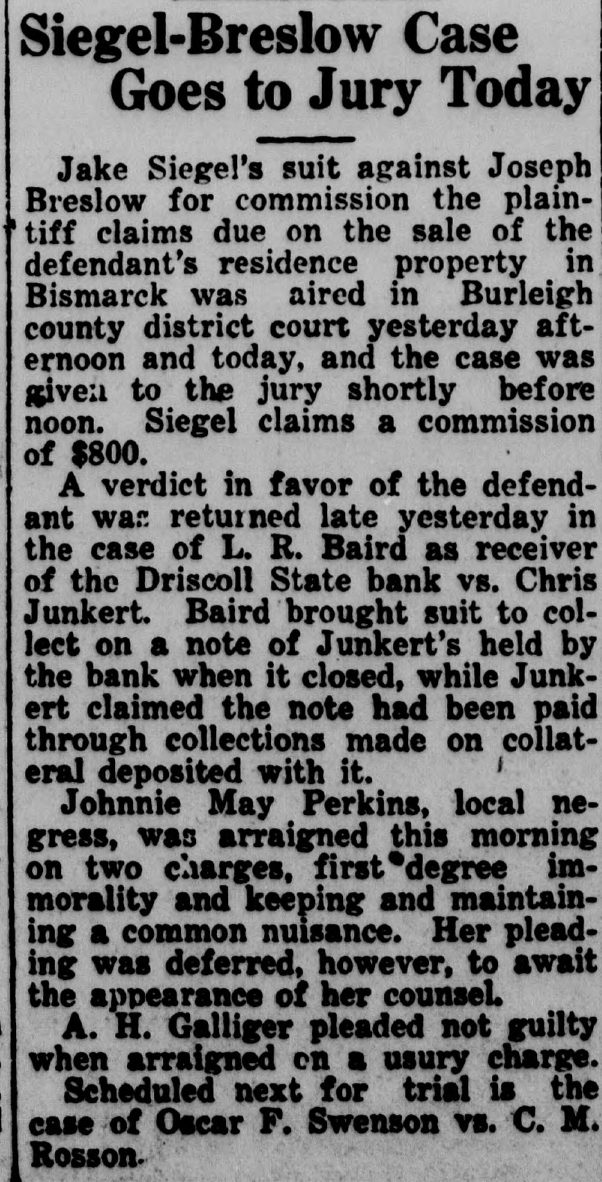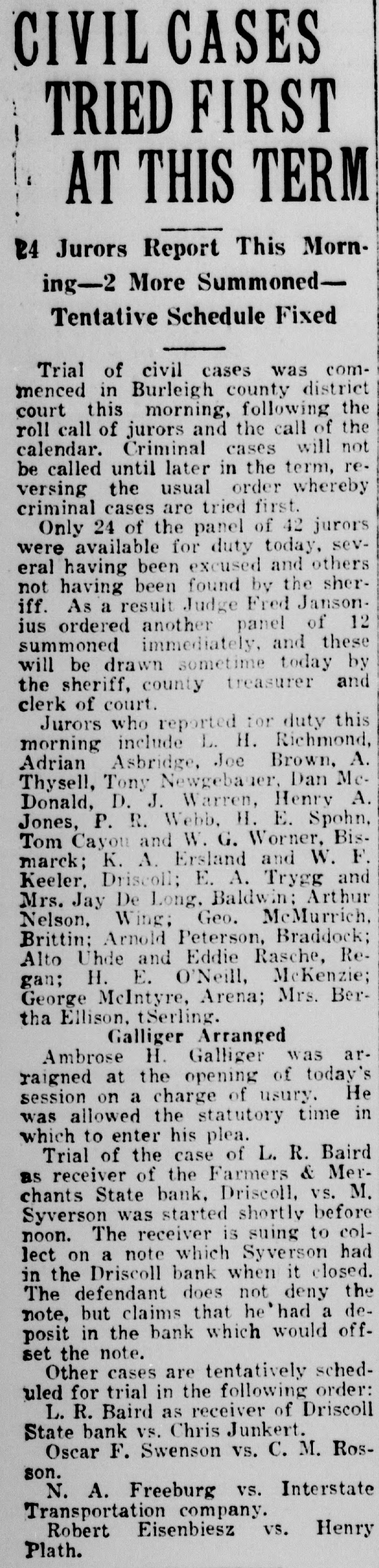 CIVIL CASES TRIED FIRST AT THIS TERM 24 Jurors Report This Morning-2 More SummonedTentative Schedule Fixed Trial of civil cases was commenced in Burleigh county district court this morning, following the roll call of jurors and the call of the calendar. Criminal cases will not be called until later in the term, reversing the usual order whereby criminal cases are tried first. Only 24 of the panel of 42 jurors were available for duty today, several having been excused and others not having been found by the sheriff. As a result Judge Fred Jansonius ordered another panel of 12 summoned immediately, and these will be drawn sometime today by the sheriff, county treasurer and clerk of court. Jurors who reported for duty this morning include L. H. Richmond, Adrian Asbridge, Joe Brown, A. Thysell, Tony Newgebauer, Dan McDonald, D. J. Warren, Henry A. Jones, P. R. Webb, H. E. Spohn, Tom Cayou and W. G. Worner, Bismarck; K. A. Ersland and W. F. Keeler. Driscoll; E. A. Trygg and Mrs. Jay De Long, Baldwin: Arthur Nelson. Wing; Geo. McMurrich, Brittin; Arnold Peterson, Braddock; Alto Uhde and Eddie Rasche, Regan; H. E. O'Neill, McKenzie; George McIntyre, Arena; Mrs. Bertha Ellison. tSerling. Galliger Arranged Ambrose H. Galliger was arraigned at the opening of today's session on a charge of usury. He was allowed the statutory time in which to enter his plea. Trial of the case of L. R. Baird as receiver of the Farmers & Merchants State bank. Driscoll, vs. M. Syverson was started shortly before noon. The receiver is suing to collect on a note which Syverson had in the Driscoll bank when it closed. The defendant does not deny the note. but claims that he'had a deposit in the bank which would offset the note. Other cases are tentatively scheduled for trial in the following order: L. R. Baird as receiver of Driscoll State bank vs. Chris Junkert. Oscar F. Swenson vs. C. M. Rosson. N. A. Freeburg vs. Interstate Transportation company. Robert Eisenbiesz vs. Henry Plath.