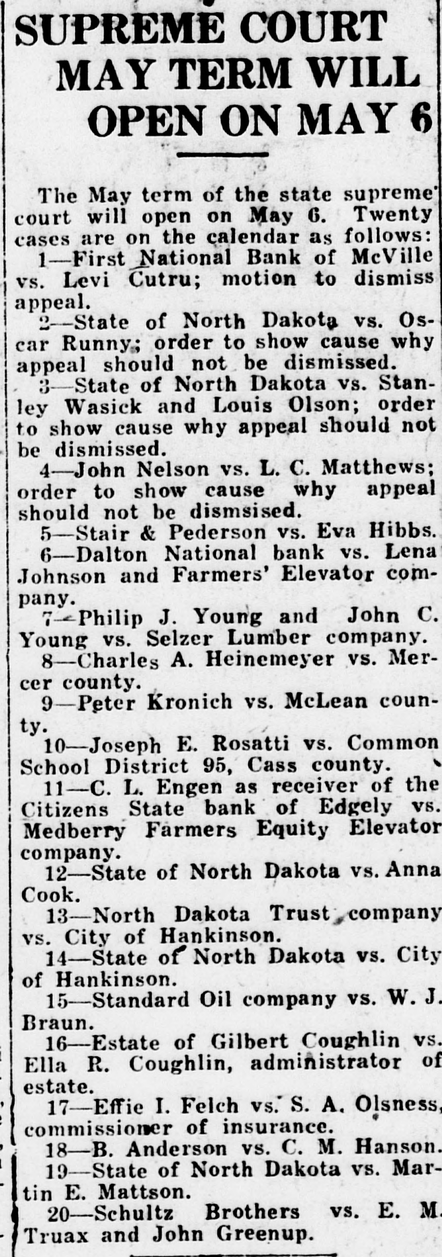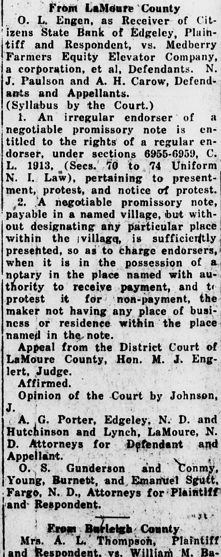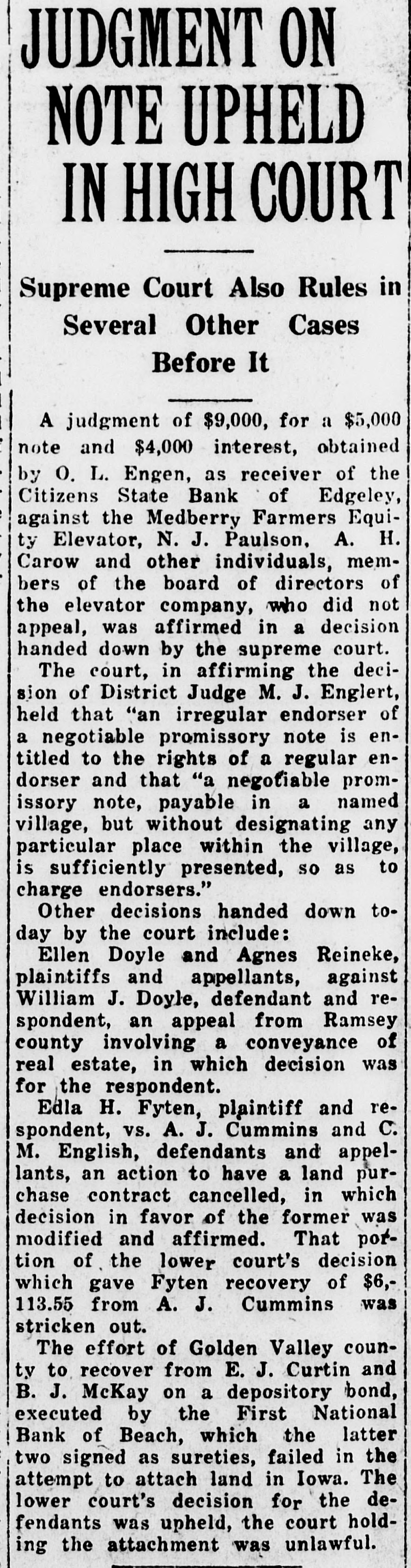 JUDGMENT ON NOTE UPHELD IN HIGH COURT Supreme Court Also Rules in Several Other Cases Before It A judgment of $9,000, for a $5,000 note and $4,000 interest, obtained by o. L. Engen, as receiver of the Citizens State Bank of Edgeley, against the Medberry Farmers Equity Elevator, N. J. Paulson, A. H. Carow and other individuals, members of the board of directors of the elevator company, who did not appeal, was affirmed in a decision handed down by the supreme court. The court, in affirming the decision of District Judge M. J. Englert, held that "an irregular endorser of a negotiable promissory note is entitled to the rights of a regular endorser and that "a negotiable promissory note, payable in a named village, but without designating any particular place within the village, is sufficiently presented, so as to charge endorsers." Other decisions handed down today by the court include: Ellen Doyle and Agnes Reineke, plaintiffs and appellants, against William J. Doyle, defendant and respondent, an appeal from Ramsey county involving a conveyance of real estate, in which decision was for the respondent. Edla H. Fyten, plaintiff and respondent, vs. A. J. Cummins and C. M. English, defendants and appellants, an action to have a land purchase contract cancelled, in which decision in favor of the former was modified and affirmed. That pottion of the lower court's decision which gave Fyten recovery of $6,113.55 from A. J. Cummins was stricken out. The effort of Golden Valley countv to recover from E. J. Curtin and B. J. McKay on a depository bond, executed by the First National Bank of Beach, which the latter two signed as sureties, failed in the attempt to attach land in Iowa. The lower court's decision for the defendants was upheld, the court holding the attachment was unlawful.