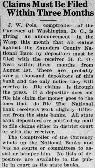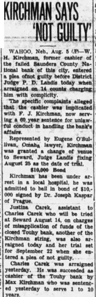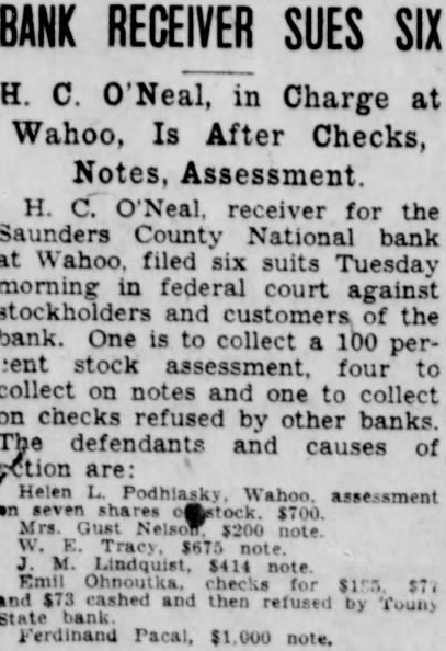 The state Banking Department closed the Nebraska Savings Bank here last Tuesday The Saunders County National Bank, operated same building the same officers, was closed the same time by order the Board Directors. Slow collections caused the banks to close doors. the depositors either penny, declared presithe two institutions. "There are adequate assets to take under the Bank After Banking the Sav ings Bank, the Board of Directors voted to close the National Organized in 1882. The bank organized by George Dorsey of mont 1882, Saunders County National came into existence two years later. banks have steadily, and were among the first small town banks state have million dollars deposits. Kirchman, president of the institutions, connected these banks continuously for almost half century. He came Wahoo, December 1884, and accepted unimportant post the bank. 1893 he pointed assistant cashier, and rise rapid thereafter. promoted vice president 1900 president 1923. Other officers the Kirchman, cashier: Malcolm cashCharles ant the Podhaisky, Teller; Max clerk; Arnold Kirchman, clerk; Roy The last statement the $273,646.32 creditthe Nebraska State Savings Bank and the Saunders County National. Total Examiner Larson charge the Savings Bank Examiner charge of the National Bank. today, State Bank George Woods declared the failure of Wahoo banks precipitated the closing of the following affiliated banks Saunders county: State Bank Touhy, ficers Petermichel, president; Kirchman, president; Kirchman, president, and and bank, Weston, whose officers Kirchman, president, Petermichel, president, Ferdinand Pacal, cashier, James Pavlik, sistant cashier, deposits $168,State bank, of Colon, whose officers are president; Bastar, Sams, vice Henderson, cashier, deposits, Oak Creek Valley bank, araiso, whose officers Kirchman, president; Jul Petermichel, Moscashier; Roh, assistgrove, cashier, deposits Examiner Nelson the Nationbanking system charge Saunders County bank, while the state charge the state Larson, State SavBank Farmers and Merchants Sorensen, State Bank, Virgil Oak Creek Valley Bank Valparaiso. While the other banks the First and Citizens State Banks fortified with large sums cash to meet demand that might made. One the heaviest creditors Saunders County National Bank Saunders County which $25,000 These funds protected by surety bonds, the responsibility the bank.