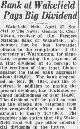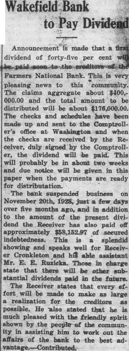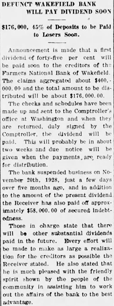 George Cronkleton, receiver of the Farmers National bank of Wakefield, ... has forwarded checks to the comptroller of the currency at Washington for signature, representing the payment of first dividend of 45 per cent to the creditors. The bank suspended Nov. 1928 . . . The dividend will be paid soon . . . will amount nearly $176,000 . . . the Wakefield trust pay other substantial dividends in the future. (Apr–May 1929 reports of dividend payments).