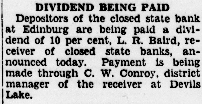 DIVIDEND BEING PAID Depositors of the closed state bank at Edinburg are being paid a dividend of 10 per cent, L. R. Baird, receiver of closed state banks, announced today. Payment is being made through C. W. Conroy, district manager of the receiver at Devils Lake.